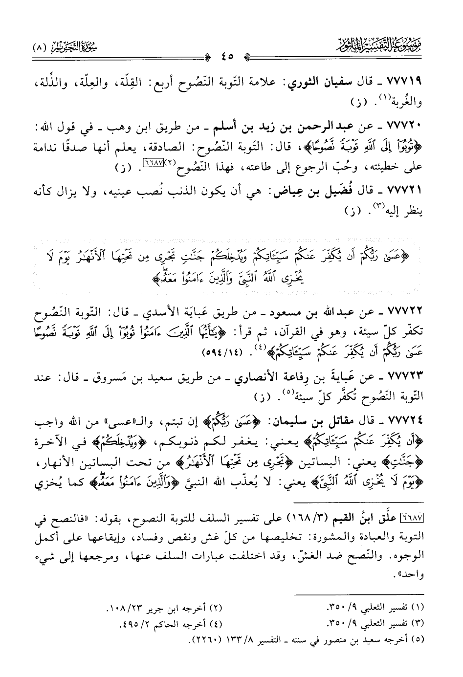 ٧٧٧٢٢ - عن عبد الله بن مسعود -من طريق عَبايَة الأسدي- قال: التّوبة النّصُوح تكفّر كلّ سيئة، وهو في القرآن، ثم قرأ: {يا أيُّها الَّذِينَ آمَنُوا تُوبُوا إلى اللَّهِ تَوْبَةً نَصُوحًا عَسى رَبُّكُمْ أنْ يُكَفِّرَ عَنْكُمْ سَيِّئاتِكُمْ} (¬٤). (١٤/ ٥٩٤)