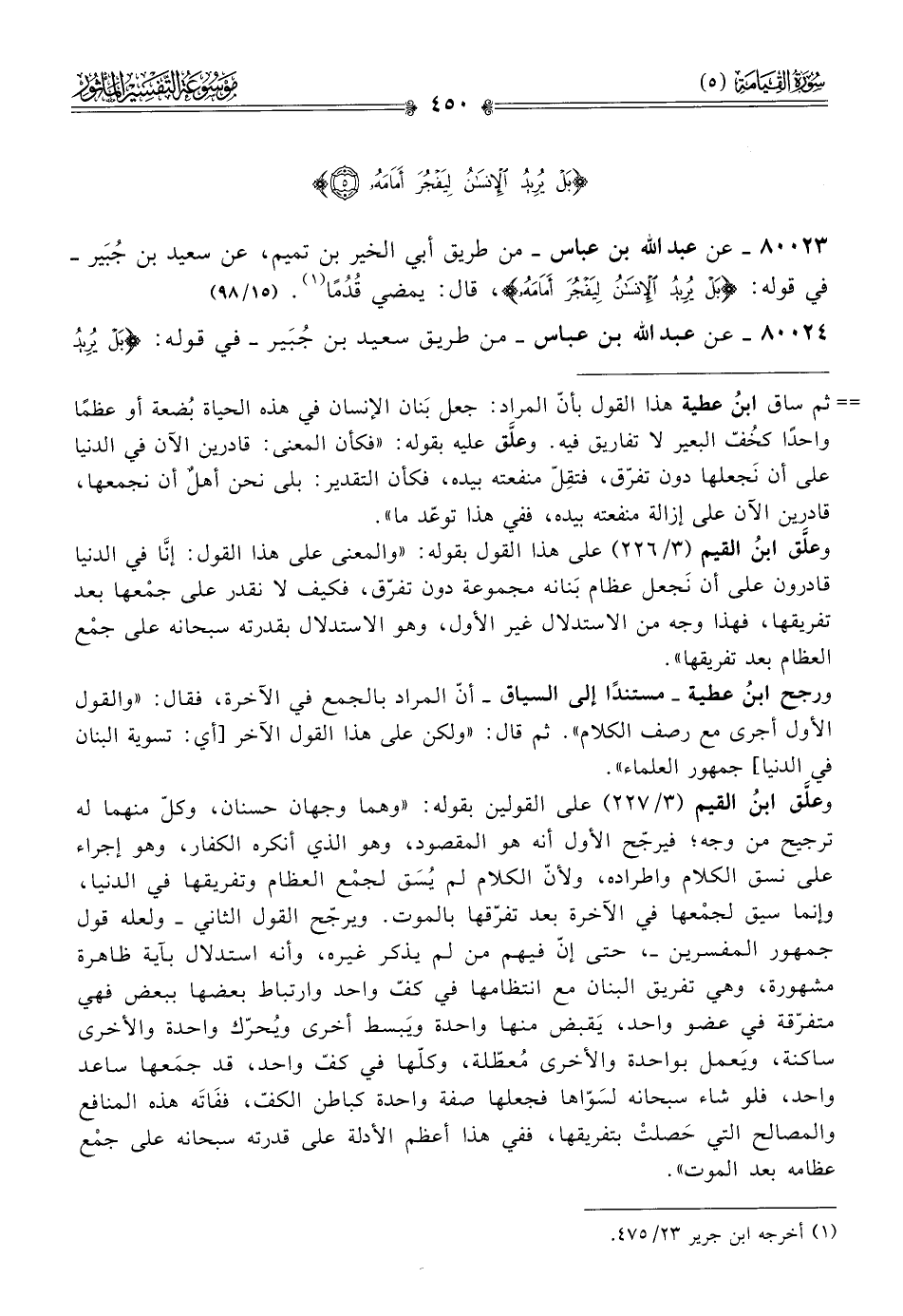 ٨٠٠٢٣ - عن عبد الله بن عباس -من طريق أبي الخير بن تميم، عن سعيد بن جُبَير- في قوله: {بَلْ يُرِيدُ الإنْسانُ لِيَفْجُرَ أمامَهُ}، قال: يمضي قُدُمًا (¬١). (١٥/ ٩٨)