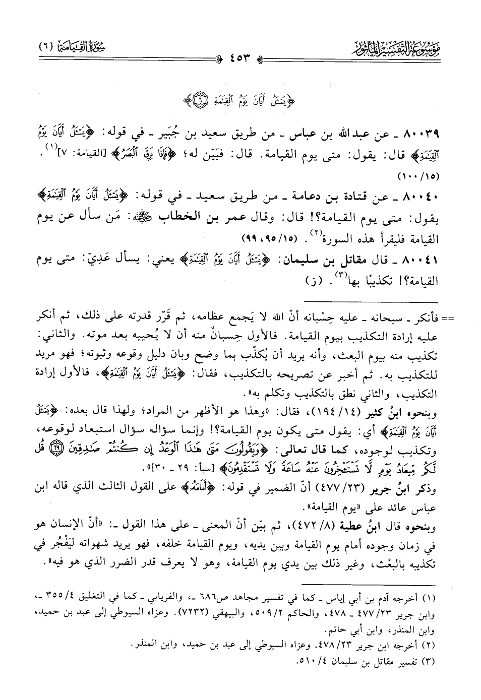 ٨٠٠٣٩ - عن عبد الله بن عباس -من طريق سعيد بن جُبَير- في قوله: {يَسْأَلُ أيّانَ يَوْمُ القِيامَةِ} قال: يقول: متى يوم القيامة. قال: فبَيّن له؛ {فَإذا بَرِقَ البَصَرُ} [القيامة: ٧] (¬١). (١٥/ ١٠٠)