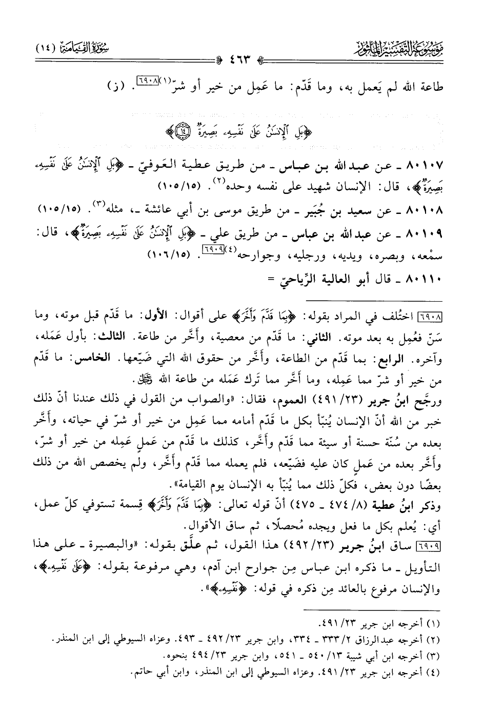 ٨٠١٠٧ - عن عبد الله بن عباس -من طريق عطية العَوفيّ- {بَلِ الإنْسانُ عَلى نَفْسِهِ بَصِيرَةٌ}، قال: الإنسان شهيد على نفسه وحده (¬٢). (١٥/ ١٠٥)