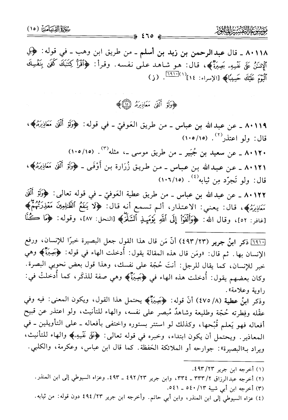٨٠١٢٢ - عن عبد الله بن عباس -من طريق عطية العَوفيّ- في قوله تعالى: {ولَوْ ألْقى مَعاذِيرَهُ}، قال: يعني: الاعتذار، ألم تسمع أنه قال: {لا يَنفَعُ الظّالِمِينَ مَعْذِرَتُهُمْ} [غافر: ٥٢]، وقال الله: {وأَلْقَوْا إلى اللهِ يَوْمَئِذٍ السَّلَمَ} [النحل: ٨٧]، وقوله: {ما كُنّا