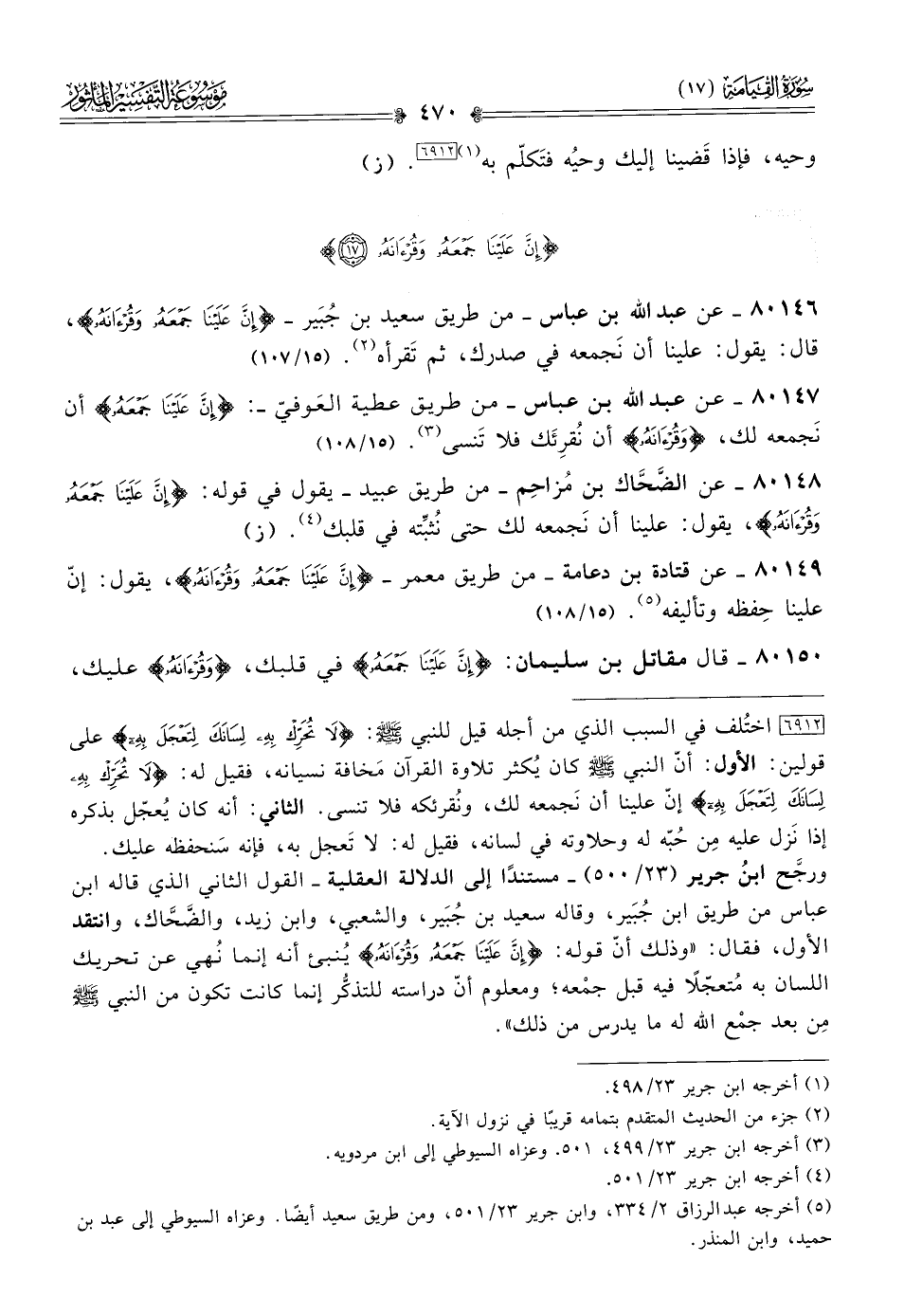 ٨٠١٤٧ - عن عبد الله بن عباس -من طريق عطية العَوفيّ-: {إنَّ عَلَيْنا جَمْعَهُ} أن نَجمعه لك، {وقُرْآنَهُ} أن نُقرِئَك فلا تَنسى (¬٣). (١٥/ ١٠٨)