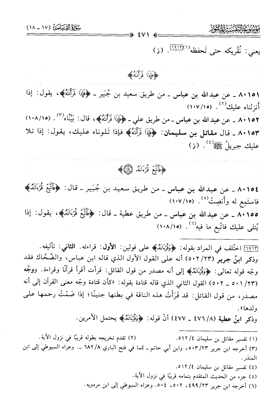 وذكر ابنُ جرير (٢٣/ ٥٠٢) أنه على القول الأول الذي قاله ابن عباس، والضَّحّاك فقد وجّه قوله تعالى: {وقرآنه} إلى أنه مصدر من قول القائل: قرأت أقرأ قرآنًا وقراءة. ووجَّه (٢٣/ ٥٠١ - ٥٠٢) القول الثاني الذي قاله قتادة بقوله: «كأن قتادة وجّه معنى القرآن إلى أنه مصدر، من قول القائل: قد قَرَأَتْ هذه الناقة في بطنها جنينًا؛ إذا ضَمّتْ رحمها على ولدها».