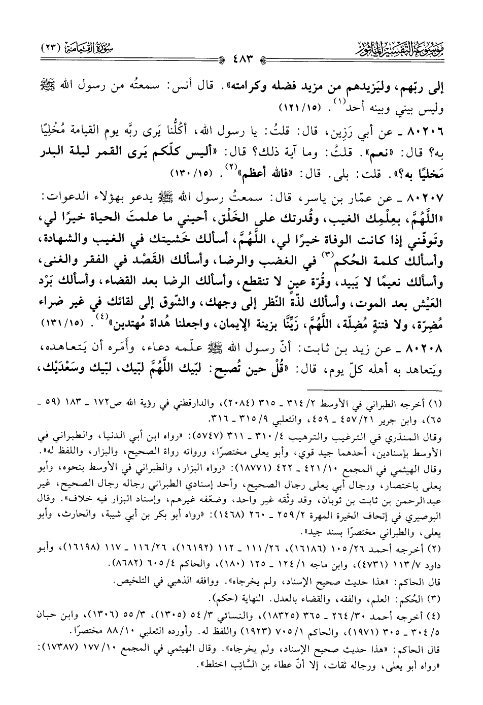 ٨٠٢٠٧ - عن عمّار بن ياسر، قال: سمعتُ رسول الله - صلى الله عليه وسلم - يدعو بهؤلاء الدعوات: «اللهم، بعِلْمِك الغيب، وقُدرتك على الخَلْق، أحيني ما علمتَ الحياة خيرًا لي، وتَوفّني إذا كانت الوفاة خيرًا لي، اللهم، أسألك خَشيتك في الغيب والشهادة، وأسألك كلمة الحُكم (¬٣) في الغضب والرضا، وأسألك القَصْد في الفقر والغنى، وأسألك نعيمًا لا يَبيد، وقُرّة عينٍ لا تنقطع، وأسألك الرضا بعد القضاء، وأسألك بَرْد العَيْش بعد الموت، وأسألك لذّة النّظر إلى وجهك، والشّوق إلى لقائك في غير ضراء مُضِرّة، ولا فتنةٍ مُضِلّة، اللهم، زَيِّنّا بزينة الإيمان، واجعلنا هُداة مُهتدين» (¬٤). (١٥/ ١٣١)