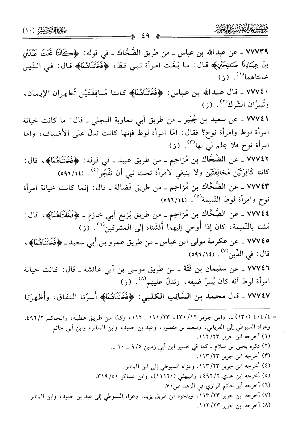 ٧٧٧٤٠ - قال عبد الله بن عباس: {فَخانَتاهُما} كانتا مُنافِقَتَيْن تُظهران الإيمان، وتُسِرّان الشّرك (¬٢). (ز)