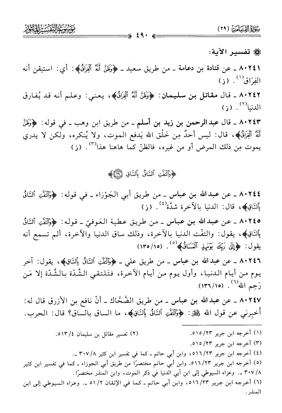 ٨٠٢٤٧ - عن عبد الله بن عباس -من طريق الضَّحّاك- أنّ نافع بن الأزرق قال له: أخبِرني عن قول الله - عز وجل -: {والتَفَّتِ السّاقُ بِالسّاقِ}، ما الساق بالساق؟ قال: الحرب.