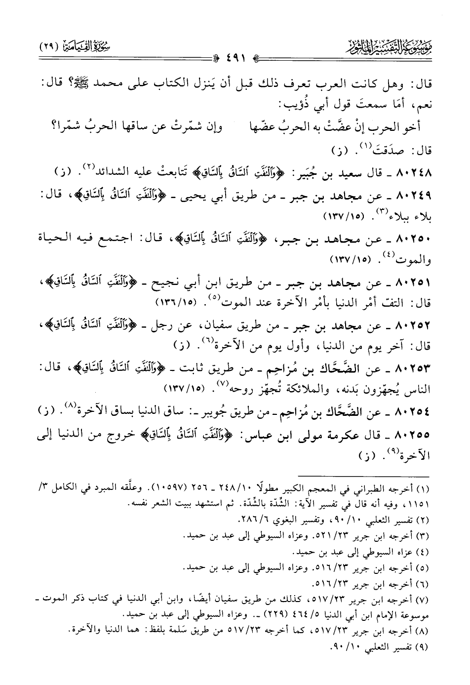 ٨٠٢٥١ - عن مجاهد بن جبر -من طريق ابن أبي نجيح- {والتَفَّتِ السّاقُ بِالسّاقِ}، قال: التفّ أمْر الدنيا بأمْر الآخرة عند الموت (¬٥). (١٥/ ١٣٦)