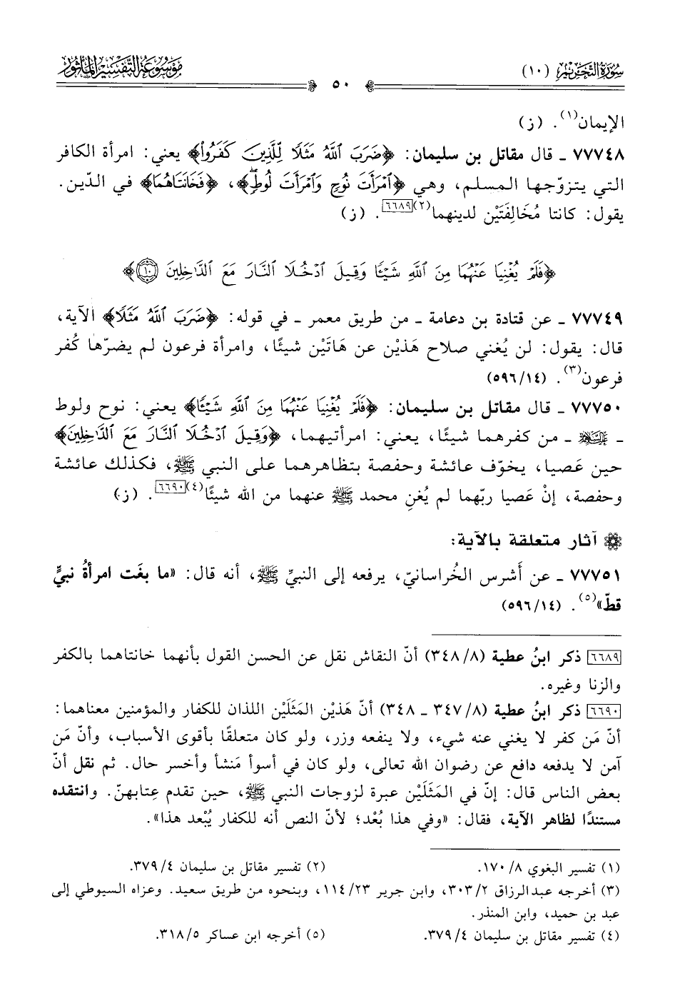 ٧٧٧٤٩ - عن قتادة بن دعامة -من طريق معمر- في قوله: {ضَرَبَ اللَّهُ مَثَلًا} الآية، قال: يقول: لن يُغني صلاح هَذيْن عن هاتَيْن شيئًا، وامرأة فرعون لم يضرّها كُفر فرعون (¬٣). (١٤/ ٥٩٦)