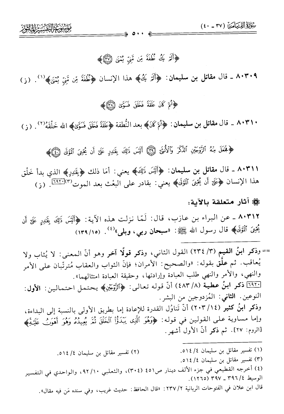 ٨٠٣١١ - قال مقاتل بن سليمان: {ألَيْسَ ذَلِكَ} يعني: أما ذلك {بِقادِرٍ} الذي بدأ خَلْق هذا الإنسان {عَلى أنْ يُحْيِيَ المَوْتى} يعني: بقادر على البعْث بعد الموت (¬٣) [٦٩٢٠]. (ز)