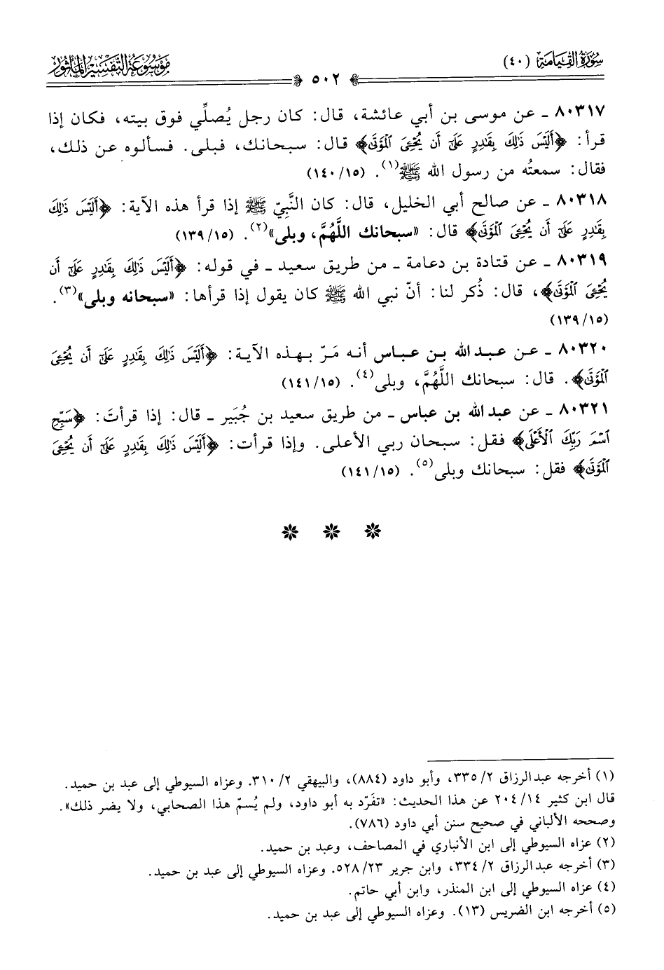 ٨٠٣١٨ - عن صالح أبي الخليل، قال: كان النَّبِيّ - صلى الله عليه وسلم - إذا قرأ هذه الآية: {ألَيْسَ ذَلِكَ بِقادِرٍ عَلى أنْ يُحْيِيَ المَوْتى} قال: «سبحانك اللهم، وبلى» (¬٢). (١٥/ ١٣٩)