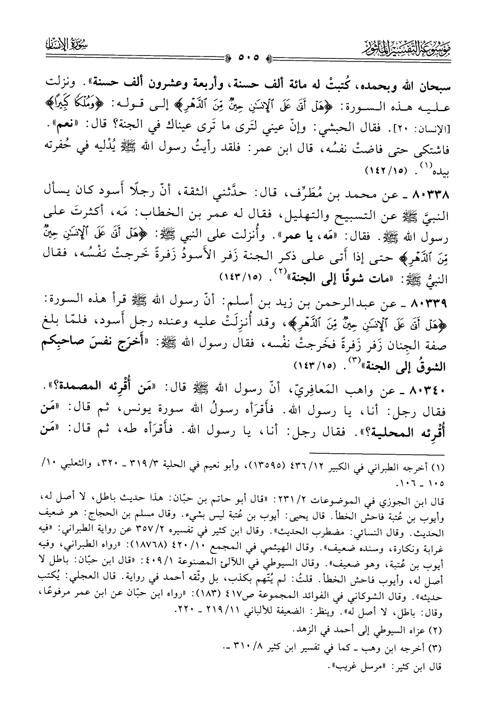 ٨٠٣٣٩ - عن عبد الرحمن بن زيد بن أسلم: أنّ رسول الله - صلى الله عليه وسلم - قرأ هذه السورة: {هَلْ أتى عَلى الإنْسانِ حِينٌ مِنَ الدَّهْر}، وقد أُنزِلَتْ عليه وعنده رجل أسود، فلمّا بلغ صفة الجِنان زَفر زَفرةً فخَرجتْ نفْسه، فقال رسول الله - صلى الله عليه وسلم -: «أخرَج نفسَ صاحبِكم الشوقُ إلى الجنة» (¬٣). (١٥/ ١٤٣)