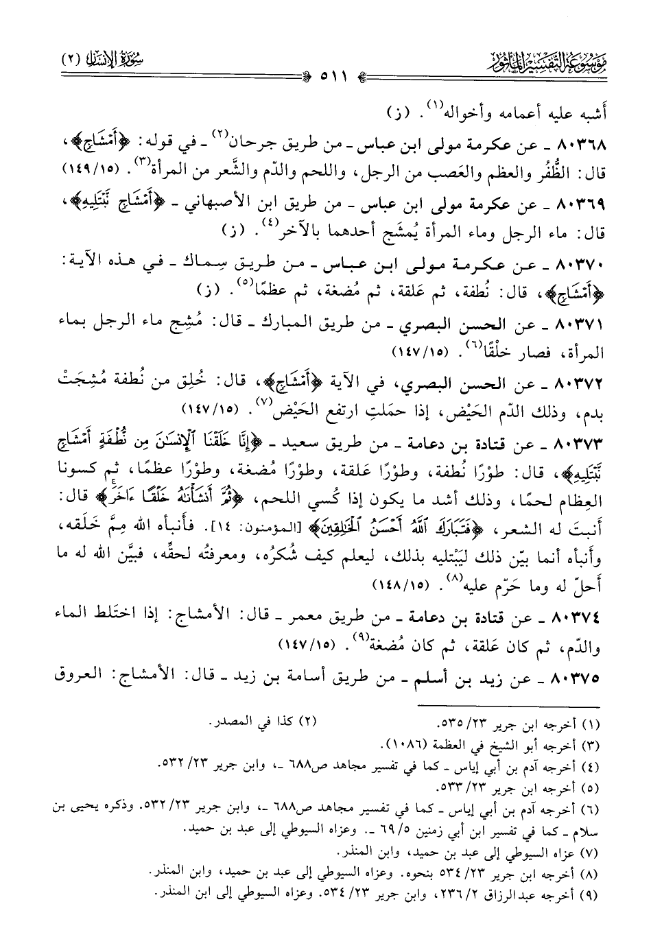 ٨٠٣٦٨ - عن عكرمة مولى ابن عباس -من طريق جرحان (¬٢) - في قوله: {أمْشاجٍ}، قال: الظُّفُر والعظم والعَصب من الرجل، واللحم والدّم والشَّعر من المرأة (¬٣). (١٥/ ١٤٩)