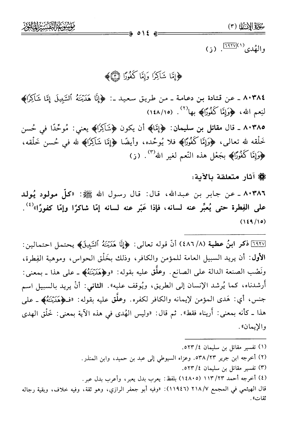 ٨٠٣٨٤ - عن قتادة بن دعامة -من طريق سعيد-: {إنّا هَدَيْناهُ السَّبِيلَ إمّا شاكِرًا} لنِعم الله، {وإمّا كَفُورًا} بها (¬٢). (١٥/ ١٤٨)