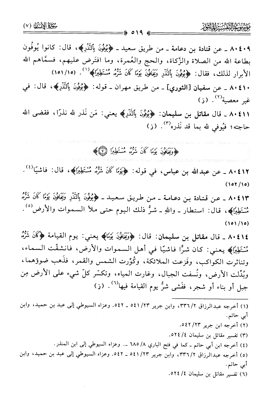 ٨٠٤٠٩ - عن قتادة بن دعامة -من طريق سعيد- {يُوفُونَ بِالنَّذْرِ}، قال: كانوا يُوفُون بطاعة الله من الصلاة والزَّكاة، والحج والعُمرة، وما افتَرض عليهم، فسمّاهم الله الأبرار لذلك، فقال: {يُوفُونَ بِالنَّذْرِ ويَخافُونَ يَوْمًا كانَ شَرُّهُ مُسْتَطِيرًا} (¬١). (١٥/ ١٥١)