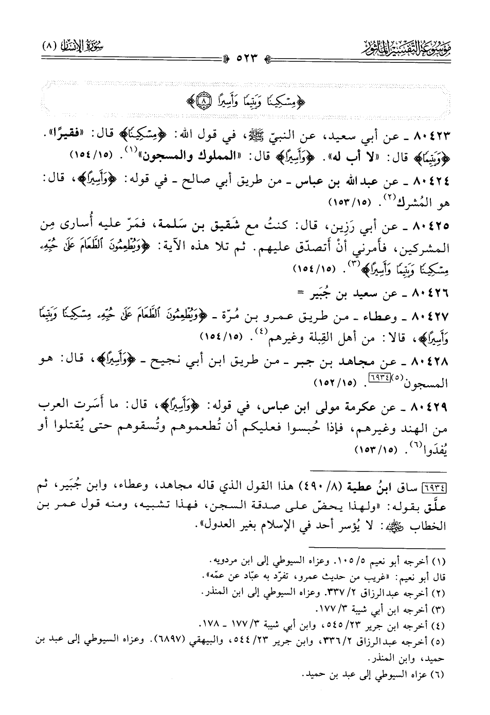 ٨٠٤٢٣ - عن أبي سعيد، عن النبيّ - صلى الله عليه وسلم -، في قول الله: {مِسْكِينًا} قال: «فقيرًا». {ويَتِيمًا} قال: «لا أب له». {وأَسِيرًا} قال: «المملوك والمسجون» (¬١). (١٥/ ١٥٤)