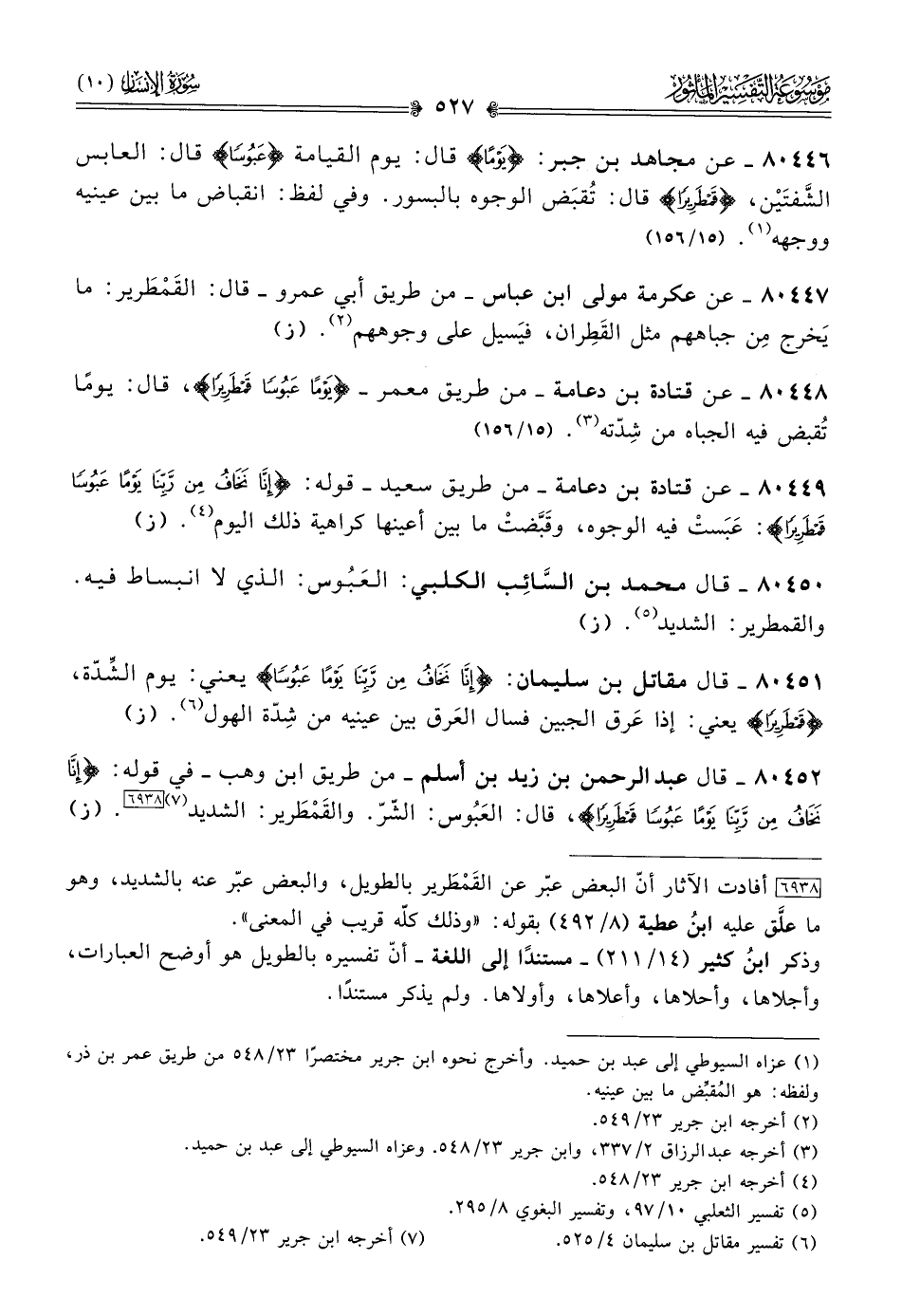 ٨٠٤٤٦ - عن مجاهد بن جبر: {يَوْمًا} قال: يوم القيامة {عَبُوسًا} قال: العابس الشَّفتَيْن، {قَمْطَرِيرًا} قال: تُقبَض الوجوه بالبسور. وفي لفظ: انقباض ما بين عينيه ووجهه (¬١). (١٥/ ١٥٦)