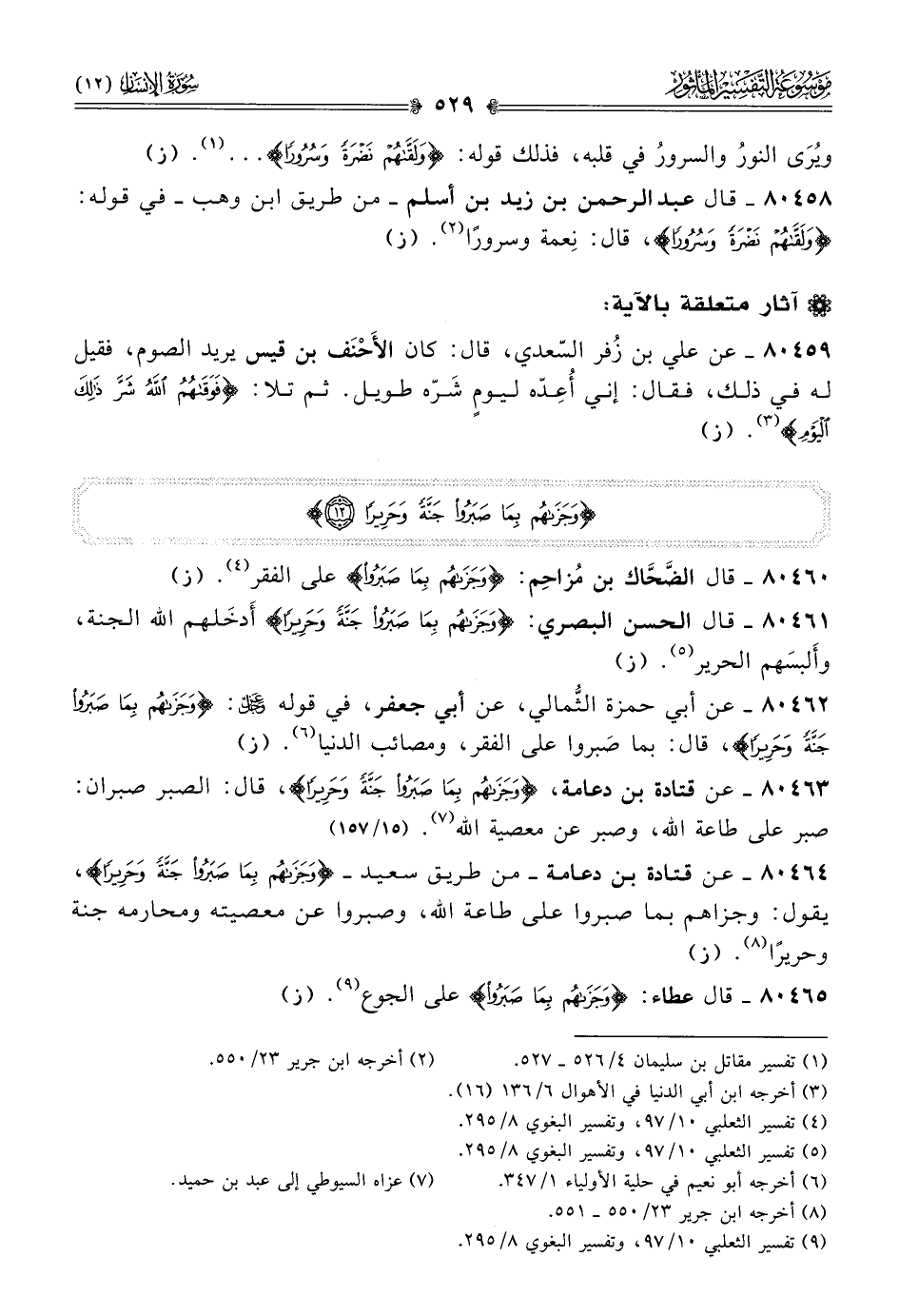 ٨٠٤٦١ - قال الحسن البصري: {وجَزاهُمْ بِما صَبَرُوا جَنَّةً وحَرِيرًا} أدخَلهم الله الجنة، وأَلبسَهم الحرير (¬٥). (ز)