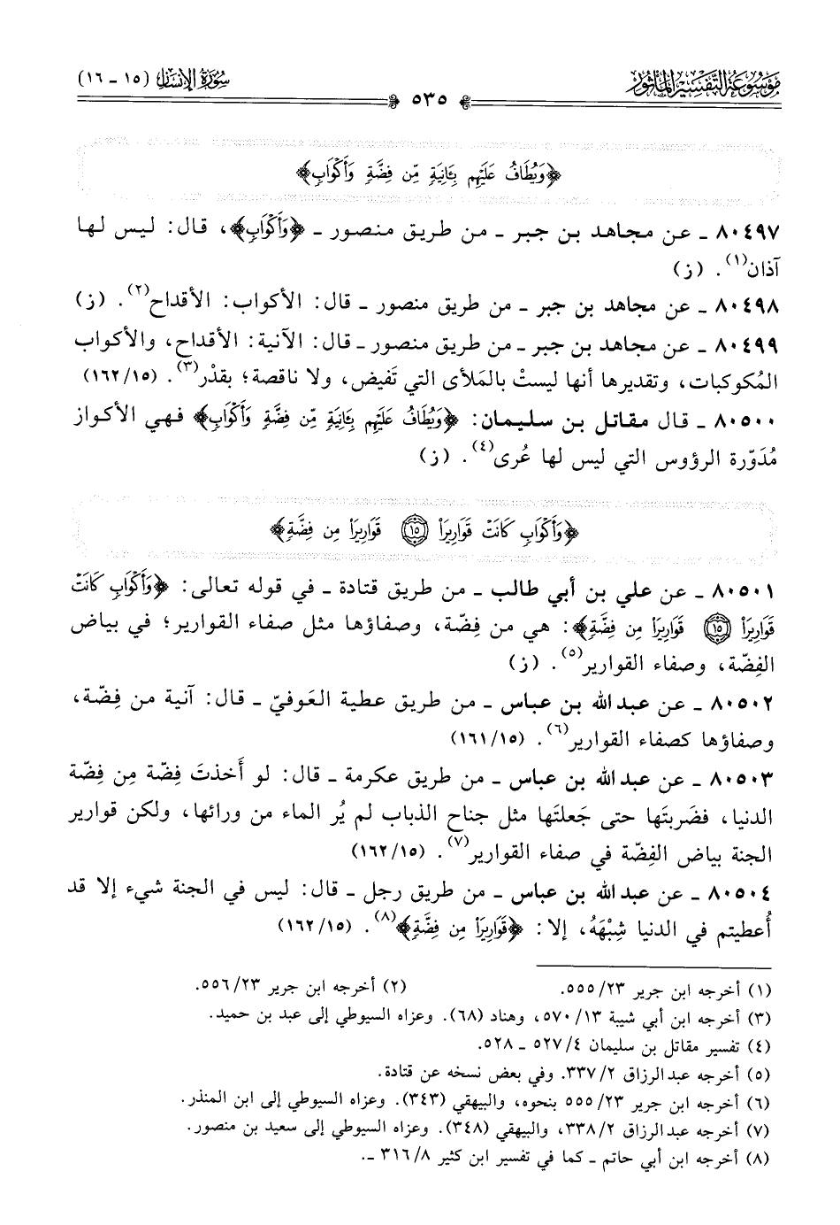 ٨٠٤٩٩ - عن مجاهد بن جبر -من طريق منصور- قال: الآنية: الأقداح، والأكواب المُكوكبات، وتقديرها أنها ليستْ بالمَلأى التي تَفيض، ولا ناقصة؛ بقدْر (¬٣). (١٥/ ١٦٢)