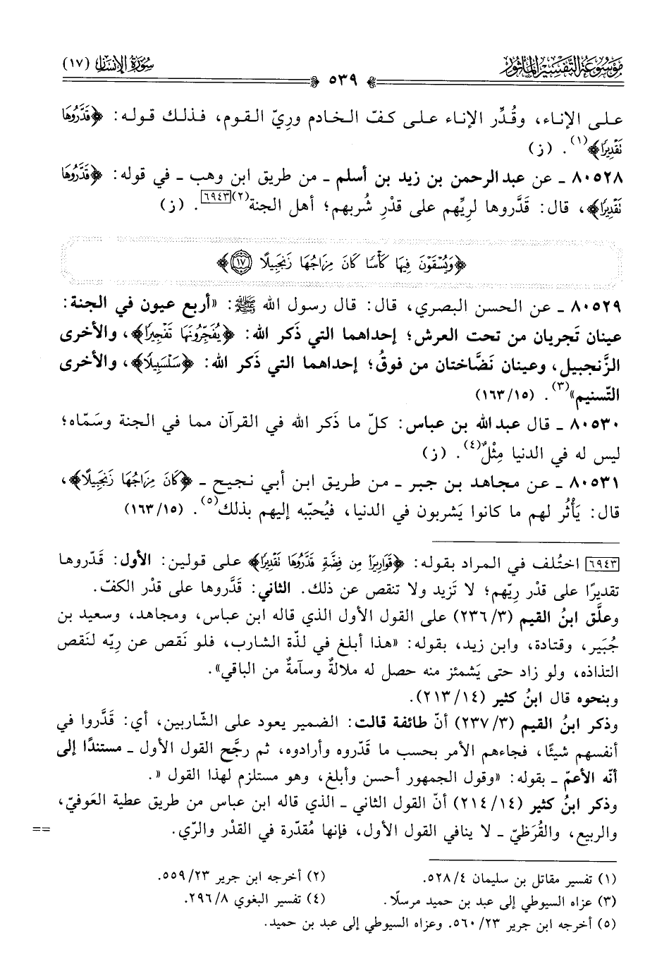٨٠٥٢٨ - عن عبد الرحمن بن زيد بن أسلم -من طريق ابن وهب- في قوله: {قَدَّرُوها تَقْدِيرًا}، قال: قَدَّروها لرِيِّهم على قدْرِ شُربهم؛ أهل الجنة (¬٢) [٦٩٤٣]. (ز)