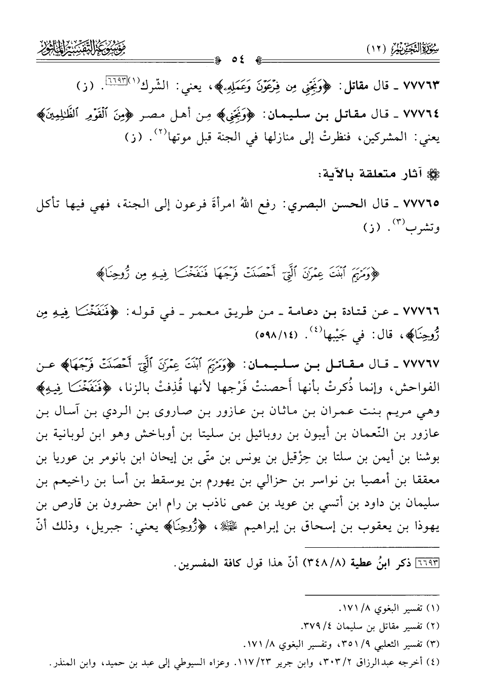 ٧٧٧٦٤ - قال مقاتل بن سليمان: {ونَجِّنِي} مِن أهل مصر {مِنَ القَوْمِ الظّالِمِينَ} يعني: المشركين، فنظرتْ إلى منازلها في الجنة قبل موتها (¬٢). (ز)