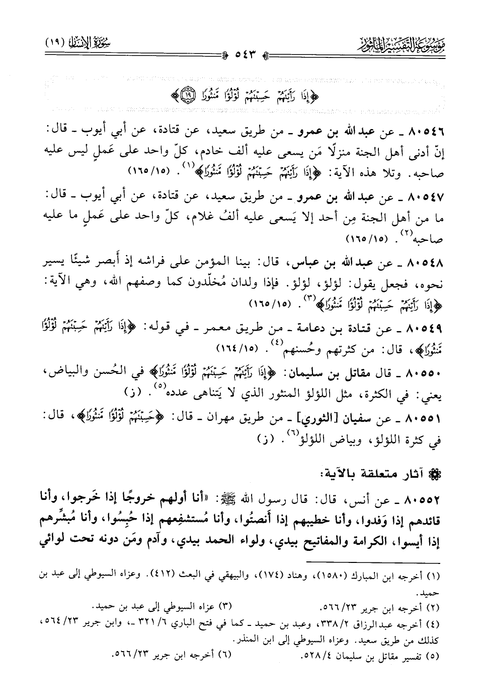 ٨٠٥٤٦ - عن عبد الله بن عمرو -من طريق سعيد، عن قتادة، عن أبي أيوب- قال: إنّ أدنى أهل الجنة منزلًا مَن يسعى عليه ألف خادم، كلّ واحد على عَملٍ ليس عليه صاحبه. وتلا هذه الآية: {إذا رَأَيْتَهُمْ حَسِبْتَهُمْ لُؤْلُؤًا مَنثُورًا} (¬١). (١٥/ ١٦٥)