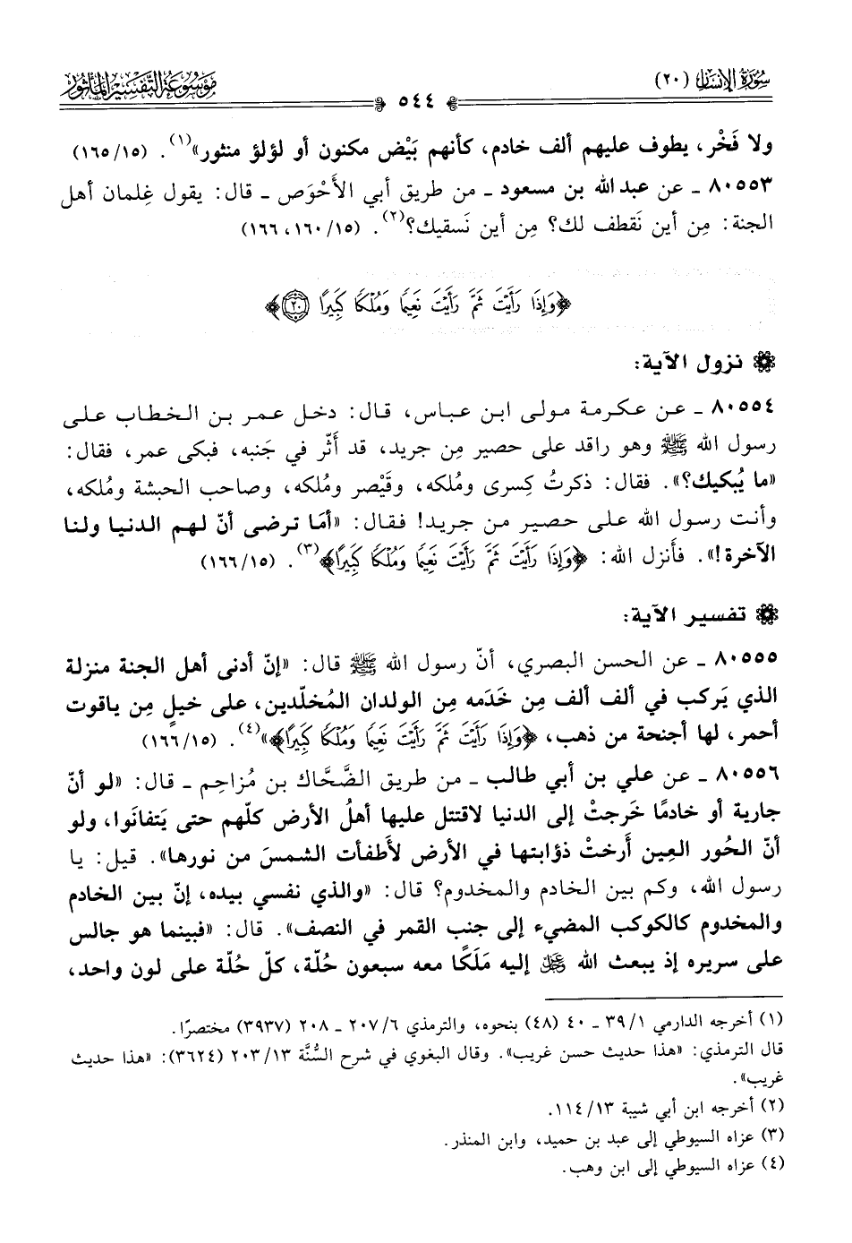 ٨٠٥٥٥ - عن الحسن البصري، أنّ رسول الله - صلى الله عليه وسلم - قال: «إنّ أدنى أهل الجنة منزلة الذي يَركب في ألف ألف مِن خَدَمه مِن الولدان المُخلّدين، على خيلٍ مِن ياقوت أحمر، لها أجنحة من ذهب، {وإذا رَأَيْتَ ثَمَّ رَأَيْتَ نَعِيمًا ومُلْكًا كَبِيرًا}» (¬٤). (١٥/ ١٦٦)