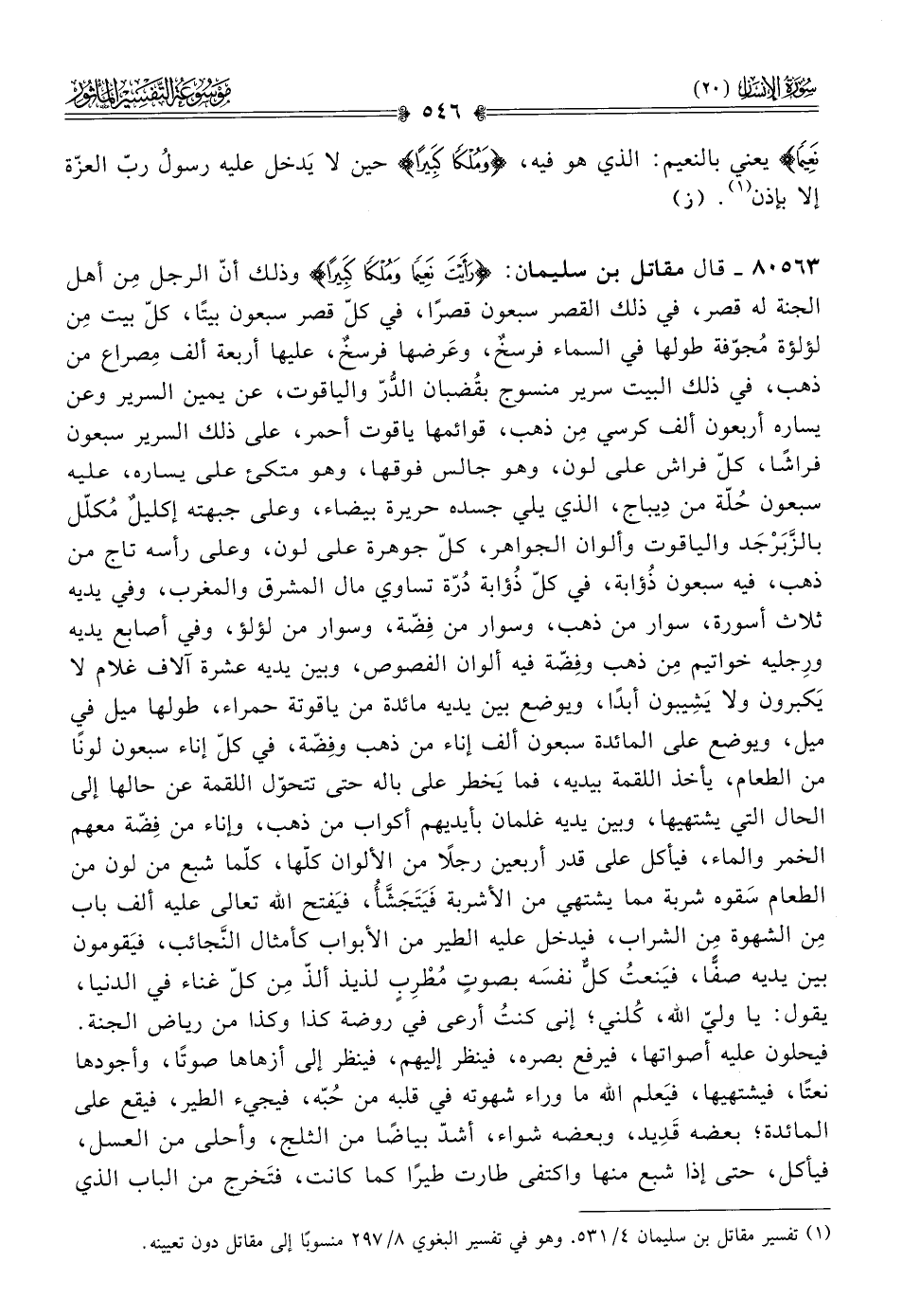 ٨٠٥٦٣ - قال مقاتل بن سليمان: {رَأَيْتَ نَعِيمًا ومُلْكًا كَبِيرًا} وذلك أنّ الرجل مِن أهل الجنة له قصر، في ذلك القصر سبعون قصرًا، في كلّ قصر سبعون بيتًا، كلّ بيت مِن لؤلؤة مُجوّفة طولها في السماء فرسخٌ، وعَرضها فرسخٌ، عليها أربعة ألف مِصراع من ذهب، في ذلك البيت سرير منسوج بقُضبان الدُّرّ والياقوت، عن يمين السرير وعن يساره أربعون ألف كرسي مِن ذهب، قوائمها ياقوت أحمر، على ذلك السرير سبعون فراشًا، كلّ فراش على لون، وهو جالس فوقها، وهو متكئ على يساره، عليه سبعون حُلّة من دِيباج، الذي يلي جسده حريرة بيضاء، وعلى جبهته إكليلٌ مُكلّل بالزَّبَرْجَد والياقوت وألوان الجواهر، كلّ جوهرة على لون، وعلى رأسه تاج من ذهب، فيه سبعون ذُؤابة، في كلّ ذُؤابة دُرّة تساوي مال المشرق والمغرب، وفي يديه ثلاث أسورة، سوار من ذهب، وسوار من فِضّة، وسوار من لؤلؤ، وفي أصابع يديه ورِجليه خواتيم مِن ذهب وفِضّة فيه ألوان الفصوص، وبين يديه عشرة آلاف غلام لا يَكبرون ولا يَشِيبون أبدًا، ويوضع بين يديه مائدة من ياقوتة حمراء، طولها ميل في ميل، ويوضع على المائدة سبعون ألف إناء من ذهب وفِضّة، في كلّ إناء سبعون لونًا من الطعام، يأخذ اللقمة بيديه، فما يَخطر على باله حتى تتحوّل اللقمة عن حالها إلى الحال التي يشتهيها، وبين يديه غلمان بأيديهم أكواب من ذهب، وإناء من فِضّة معهم الخمر والماء، فيأكل على قدر أربعين رجلًا من الألوان كلّها، كلّما شبع من لون من الطعام سَقوه شربة مما يشتهي من الأشربة فَيَتَجَشَّأُ، فيَفتح الله تعالى عليه ألف باب مِن الشهوة مِن الشراب، فيدخل عليه الطير من الأبواب كأمثال النَّجائب، فيَقومون بين يديه صفًّا، فيَنعتُ كلٌّ نفسَه بصوتٍ مُطْرِبٍ لذيذ ألذّ مِن كلّ غناء في الدنيا، يقول: يا وليّ الله، كُلني؛ إنى كنتُ أرعى في روضة كذا وكذا من رياض الجنة. فيحلون عليه أصواتها، فيرفع بصره، فينظر إليهم، فينظر إلى أزهاها صوتًا، وأجودها نعتًا، فيشتهيها، فيَعلم الله ما وراء شهوته في قلبه من حُبّه، فيجيء الطير، فيقع على المائدة؛ بعضه قَدِيد، وبعضه شواء، أشدّ بياضًا من الثلج، وأحلى من العسل، فيأكل، حتى إذا شبع منها واكتفى طارت طيرًا كما كانت، فتَخرج من الباب الذي