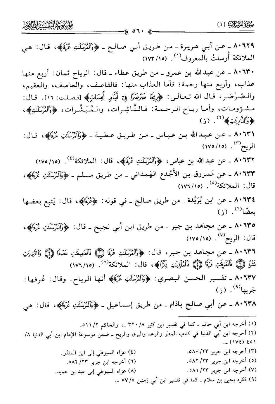 ٨٠٦٣١ - عن عبد الله بن عباس -من طريق عطية- {والمرسلات عُرْفًا}، قال: الريح (¬٣). (١٥/ ١٧٥)