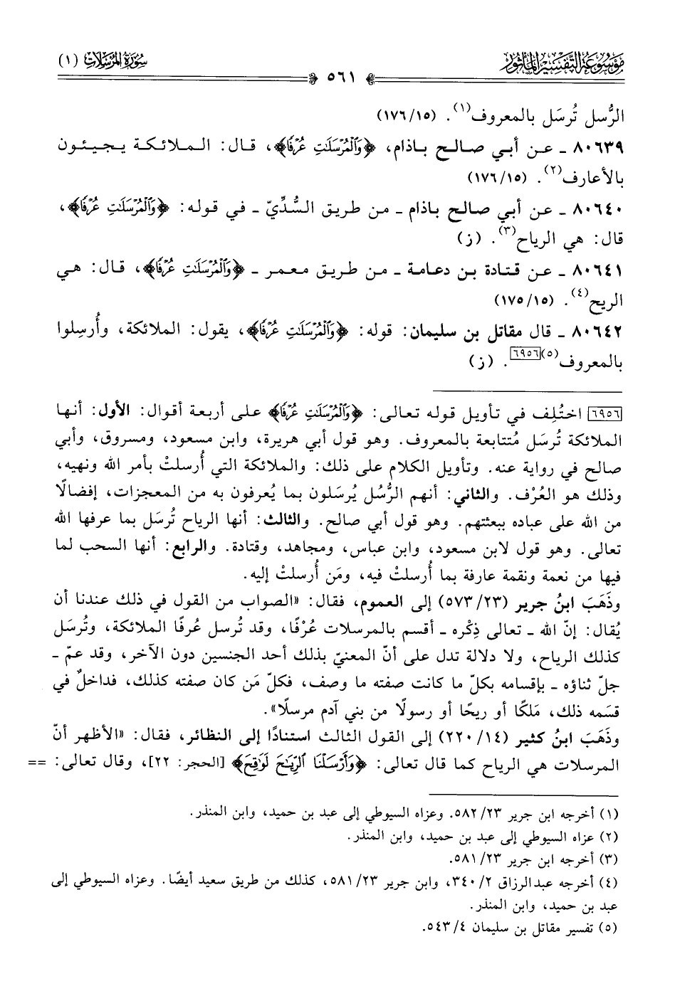 ٨٠٦٤٠ - عن أبي صالح باذام -من طريق السُّدِّيّ- في قوله: {والمرسلات عُرْفًا}، قال: هي الرياح (¬٣). (ز)