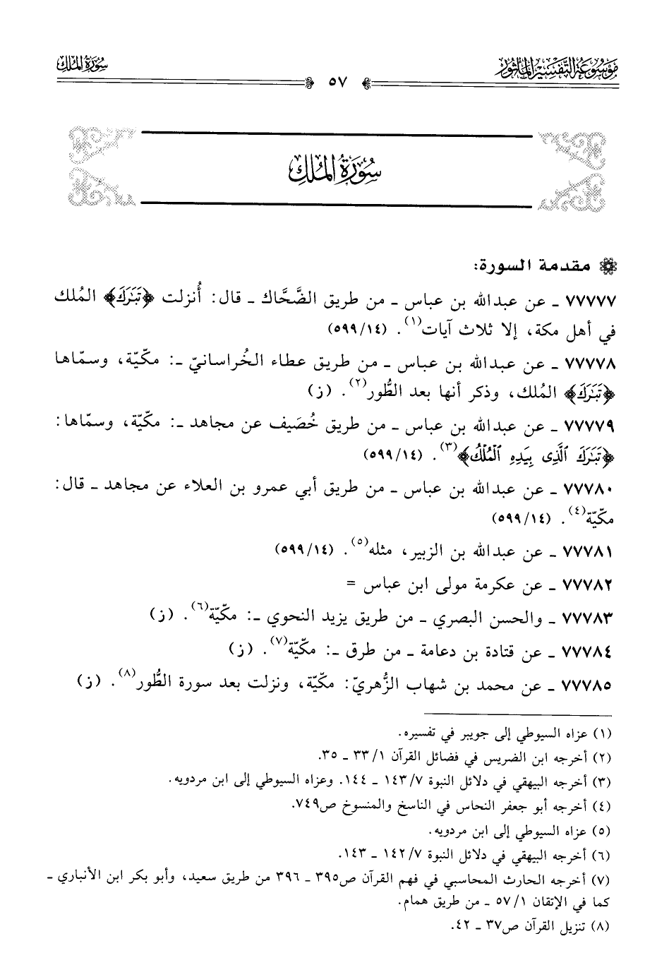 ٧٧٧٧٩ - عن عبد الله بن عباس -من طريق خُصَيف عن مجاهد-: مكّيّة، وسمّاها: {تَبارَكَ الَّذِي بِيَدِهِ المُلْكُ} (¬٣). (١٤/ ٥٩٩)