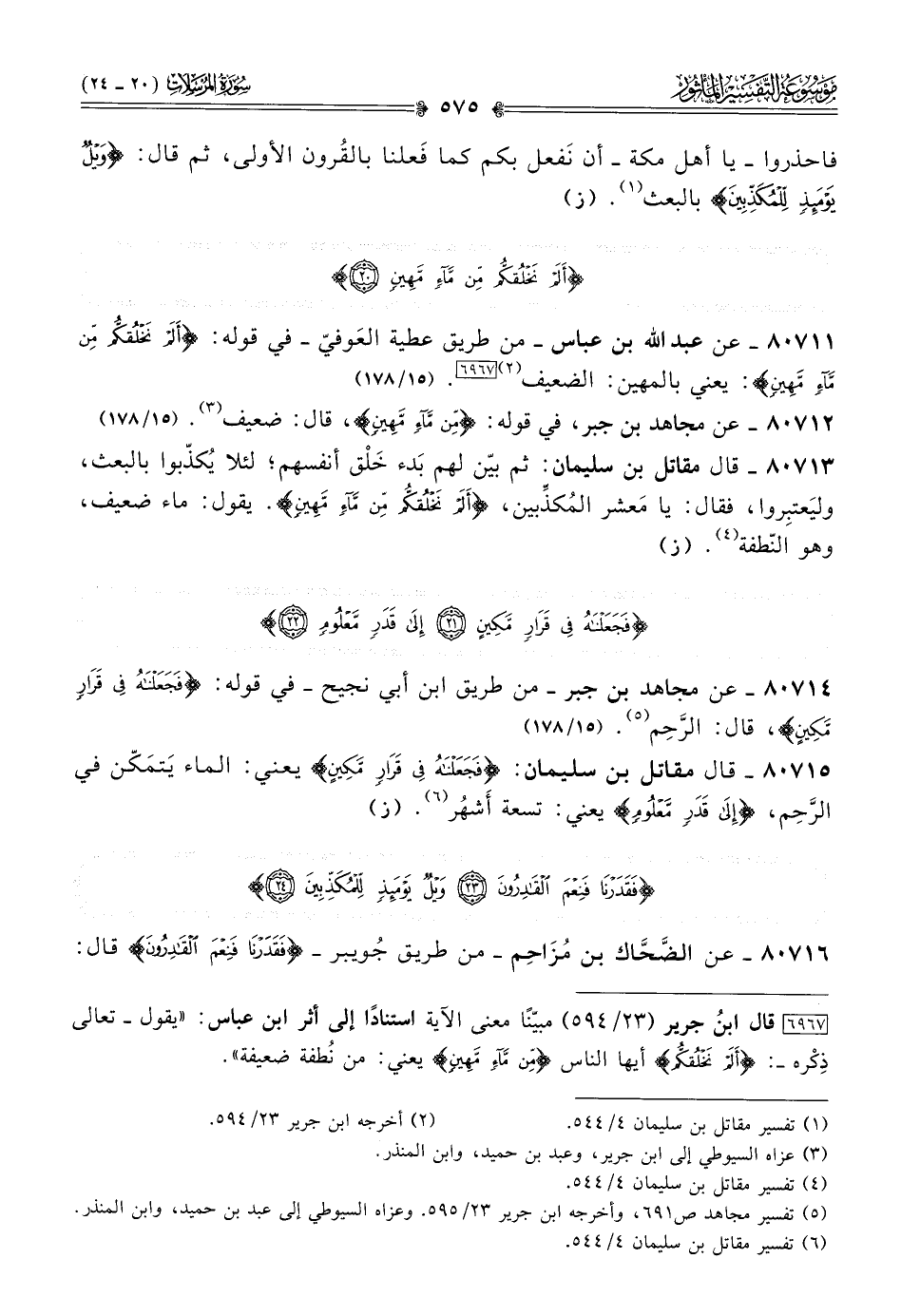 [٦٩٦٧] قال ابنُ جرير (٢٣/ ٥٩٤) مبيّنًا معنى الآية استنادًا إلى أثر ابن عباس: «يقول -تعالى ذِكْره-: {ألم نخلقكم} أيها الناس {من ماء مهين} يعني: من نُطفة ضعيفة».