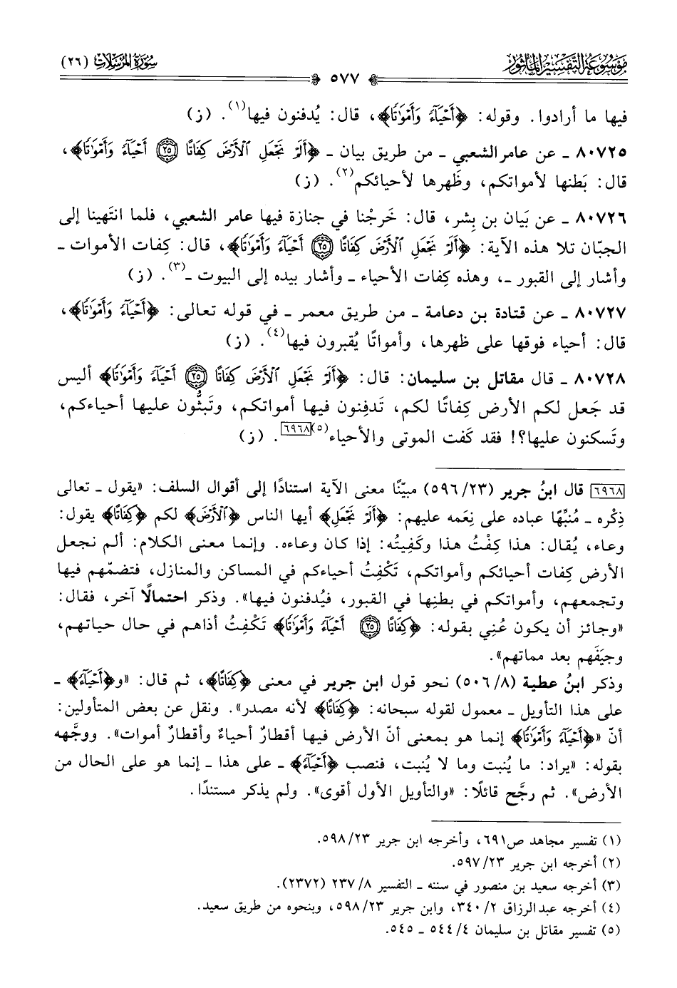 [٦٩٦٨] قال ابنُ جرير (٢٣/ ٥٩٦) مبيّنًا معنى الآية استنادًا إلى أقوال السلف: «يقول -تعالى ذِكْره- مُنبِّهًا عباده على نِعَمه عليهم: {ألم نجعل} أيها الناس {الأرض} لكم {كفاتا} يقول: وعاء، يُقال: هذا كِفْتُ هذا وكَفِيتُه: إذا كان وعاءه. وإنما معنى الكلام: ألم نجعل الأرض كِفات أحيائكم وأمواتكم، تَكْفِتُ أحياءكم في المساكن والمنازل، فتضمّهم فيها وتجمعهم، وأمواتكم في بطنِها في القبور، فيُدفنون فيها». وذكر احتمالًا آخر، فقال: «وجائز أن يكون عُنِي بقوله: {كفاتا أحياء وأمواتا} تَكْفِتُ أذاهم في حال حياتهم، وجيَفَهم بعد مماتهم».