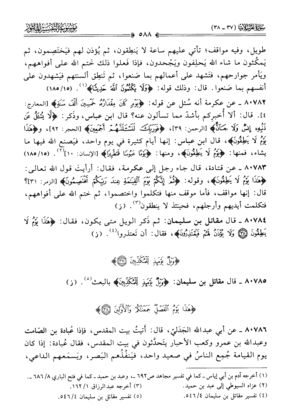 ٨٠٧٨٤ - قال مقاتل بن سليمان: ثم ذَكر الويل متى يكون، فقال: {هَذا يَوْمُ لا يَنْطِقُونَ ولا يُؤْذَنُ لَهُمْ فَيَعْتَذِرُونَ}، فقال: أن تَعتذروا (¬٤). (ز)