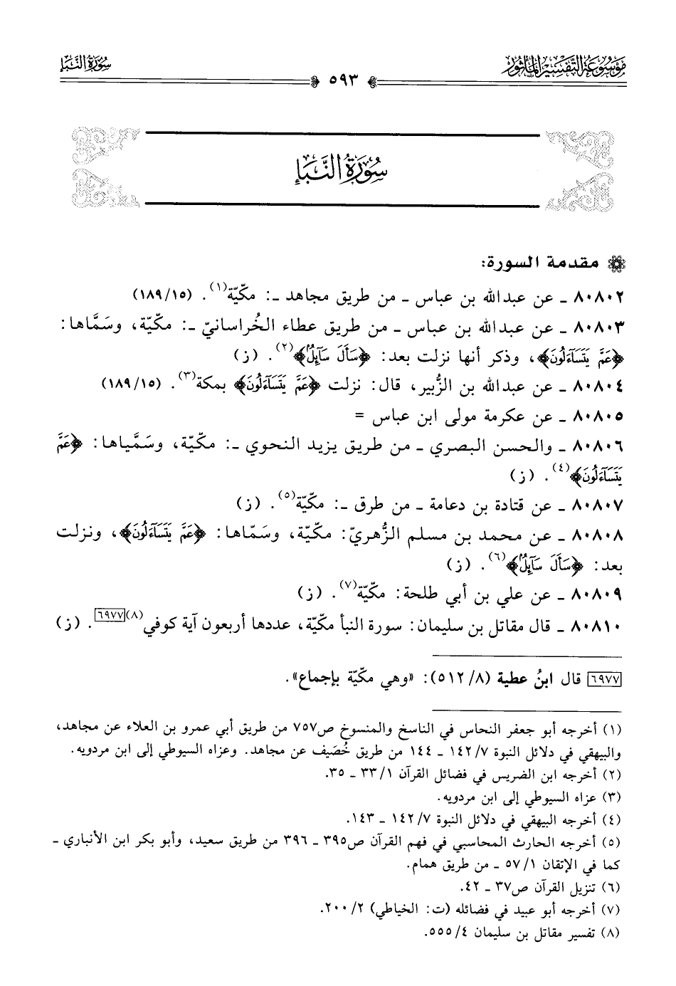 ٨٠٨٠٣ - عن عبد الله بن عباس -من طريق عطاء الخُراسانيّ-: مكّيّة، وسَمّاها: {عَمَّ يَتَساءَلُونَ}، وذكر أنها نزلت بعد: {سَأَلَ سائِلٌ} (¬٢). (ز)
