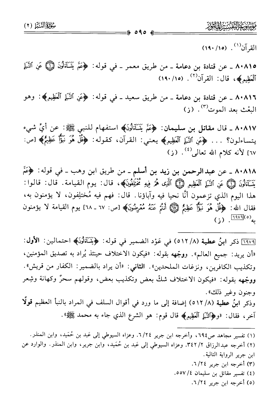 ٨٠٨١٥ - عن قتادة بن دعامة -من طريق معمر- في قوله: {عَمَّ يَتَساءَلُونَ عَنِ النَّبَإ العَظِيمِ}، قال: القرآن (¬٢). (١٥/ ١٩٠)