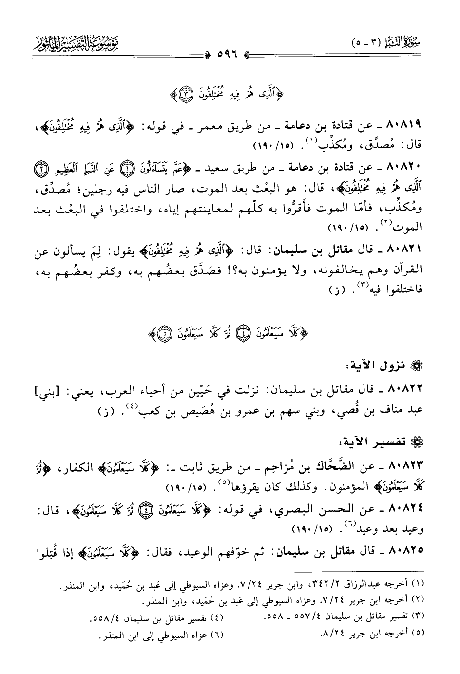 ٨٠٨٢٠ - عن قتادة بن دعامة -من طريق سعيد- {عَمَّ يَتَساءَلُونَ عَنِ النَّبَإ العَظِيمِ الَّذِي هُمْ فِيهِ مُخْتَلِفُونَ}، قال: هو البعْث بعد الموت، صار الناس فيه رجلين؛ مُصدِّق، ومُكذِّب، فأمّا الموت فأَقرُّوا به كلّهم لمعاينتهم إياه، واختلفوا في البعْث بعد الموت (¬٢). (١٥/ ١٩٠)