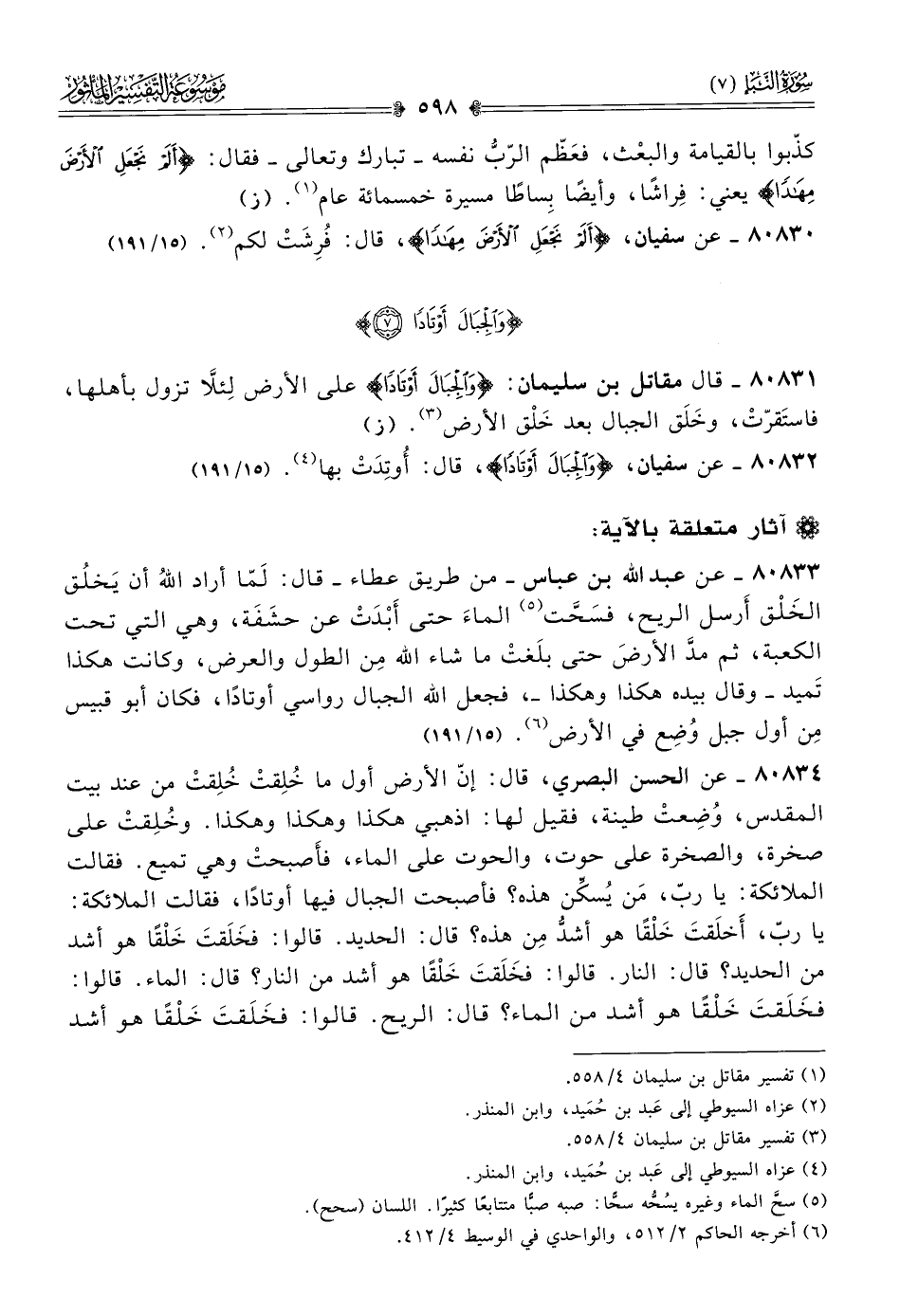 ٨٠٨٣١ - قال مقاتل بن سليمان: {والجِبالَ أوْتادا} على الأرض لِئلّا تزول بأهلها، فاستَقرّتْ، وخَلَق الجبال بعد خَلْق الأرض (¬٣). (ز)