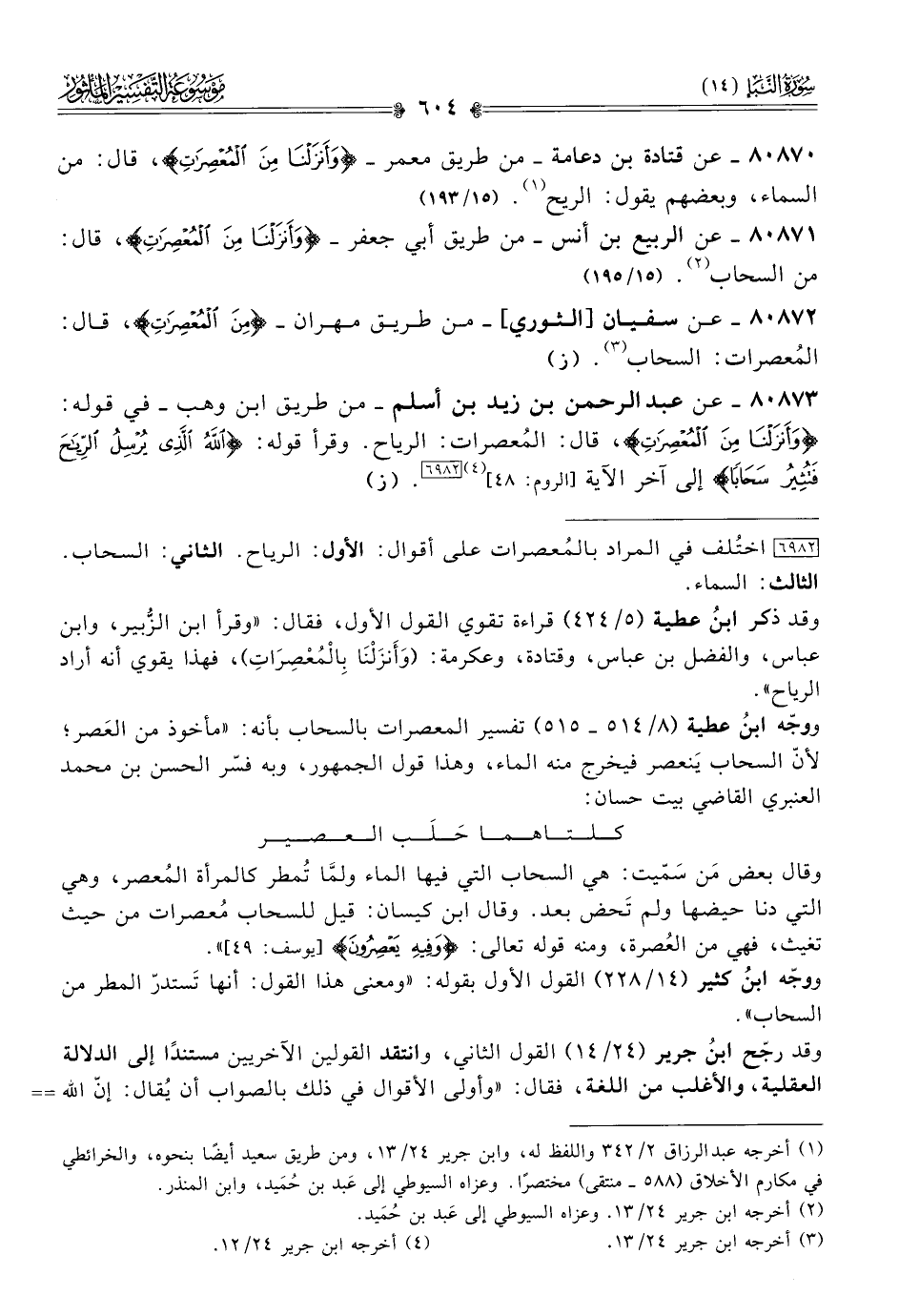 ٨٠٨٧١ - عن الربيع بن أنس -من طريق أبي جعفر- {وأَنْزَلْنا مِنَ المُعْصِراتِ}، قال: من السحاب (¬٢). (١٥/ ١٩٥)