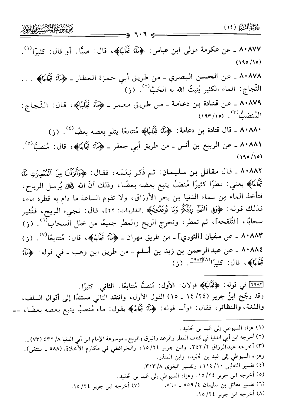 ٨٠٨٨٠ - قال قتادة بن دعامة: {ماءً ثَجّاجًا} مُتتابعًا يتلو بعضه بعضًا (¬٤). (ز)