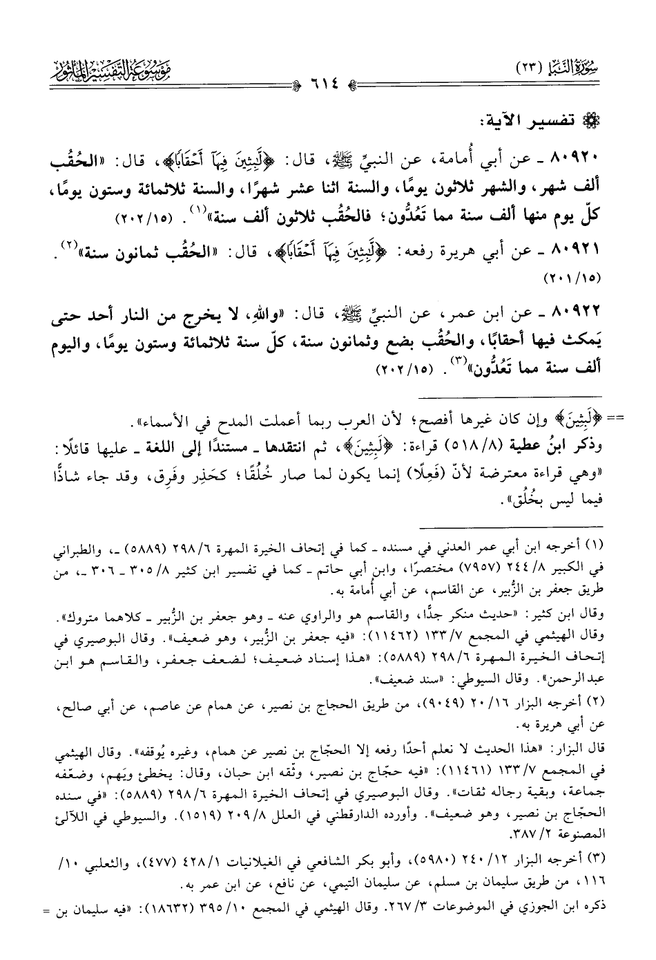 ٨٠٩٢٠ - عن أبي أُمامة، عن النبيِّ - صلى الله عليه وسلم -، قال: {لابِثِينَ فِيها أحْقابًا}، قال: «الحُقُب ألف شهر، والشهر ثلاثون يومًا، والسنة اثنا عشر شهرًا، والسنة ثلاثمائة وستون يومًا، كلّ يوم منها ألف سنة مما تَعُدُّون؛ فالحُقُب ثلاثون ألف سنة» (¬١). (١٥/ ٢٠٢)
