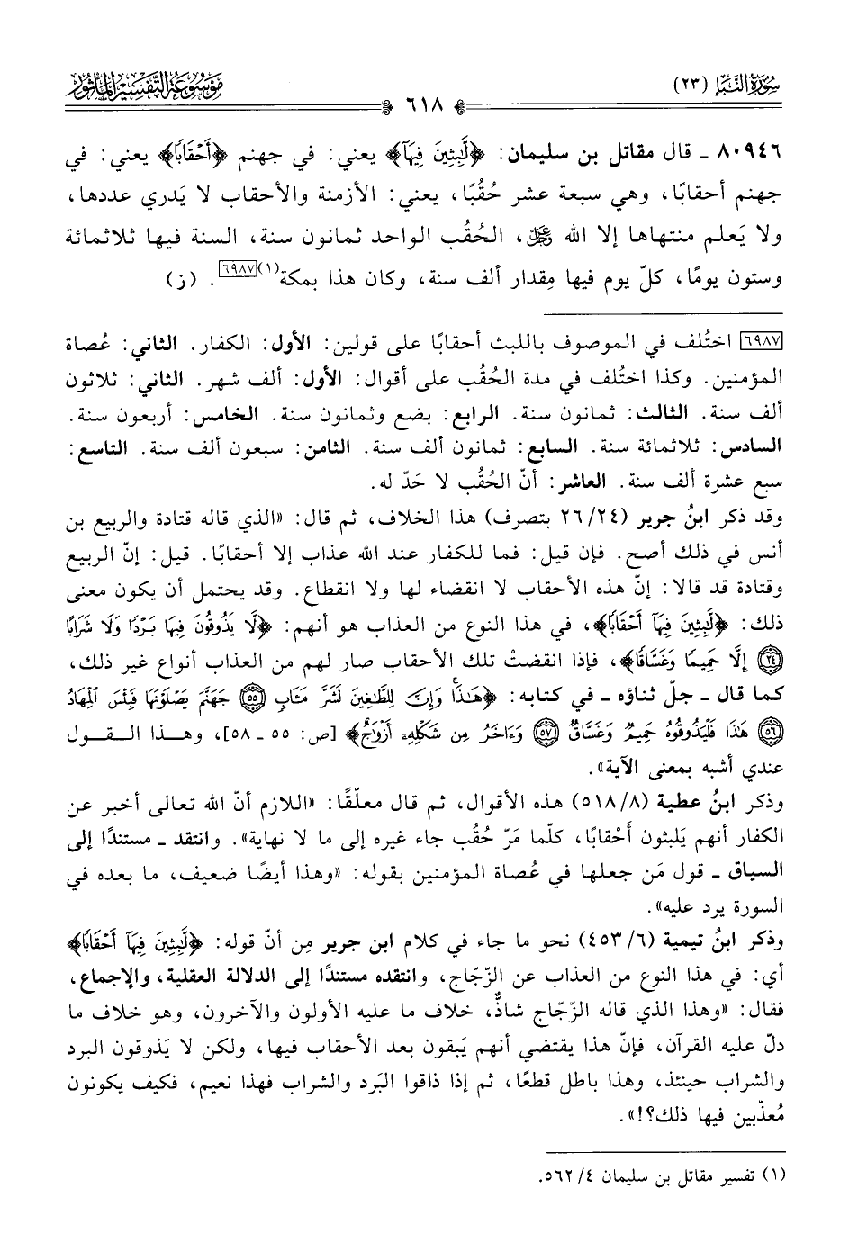 [٦٩٨٧] اختُلف في الموصوف باللبث أحقابًا على قولين: الأول: الكفار. الثاني: عُصاة المؤمنين. وكذا اختُلف في مدة الحُقُب على أقوال: الأول: ألف شهر. الثاني: ثلاثون ألف سنة. الثالث: ثمانون سنة. الرابع: بضع وثمانون سنة. الخامس: أربعون سنة. السادس: ثلاثمائة سنة. السابع: ثمانون ألف سنة. الثامن: سبعون ألف سنة. التاسع: سبع عشرة ألف سنة. العاشر: أنّ الحُقُب لا حَدّ له.