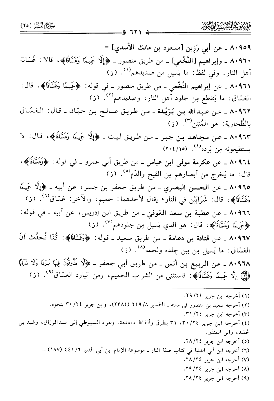 ٨٠٩٦٠ - وإبراهيم [النَّخْعي]-من طريق منصور- {إلّا حَمِيمًا وغَسّاقًا}، قالا: غُسالة أهل النار. وفي لفظ: ما يَسيل من صديدهم (¬١). (ز)