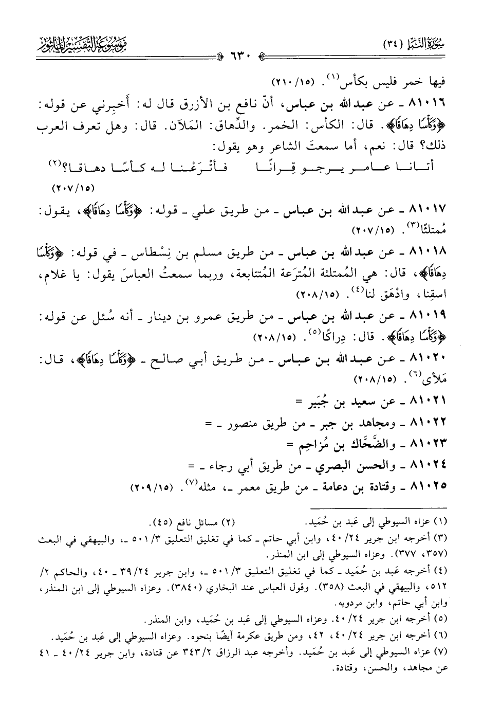 ٨١٠١٦ - عن عبد الله بن عباس، أنّ نافع بن الأزرق قال له: أخبِرني عن قوله: {وكَأْسًا دِهاقًا}. قال: الكأس: الخمر. والدِّهاق: المَلآن. قال: وهل تعرف العرب ذلك؟ قال: نعم، أما سمعتَ الشاعر وهو يقول: