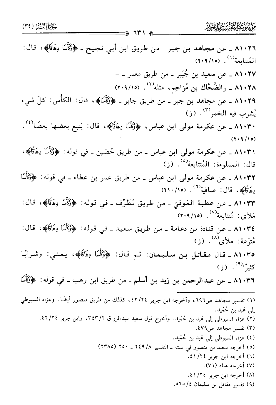 ٨١٠٣١ - عن عكرمة مولى ابن عباس -من طريق حُصَين- في قوله: {وكأسا دهاقا}، قال: المملوءة: المُتتابعة (¬٥). (ز)