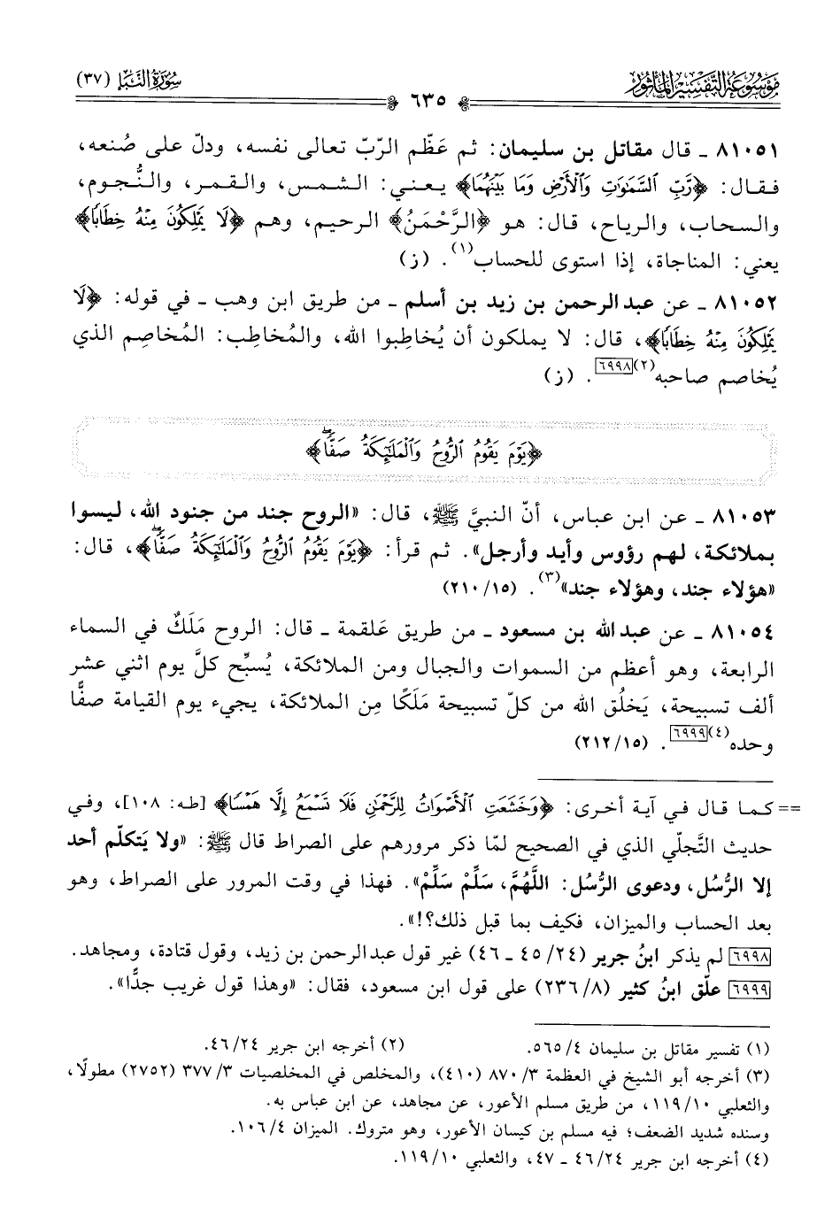 ٨١٠٥٣ - عن ابن عباس، أنّ النبيَّ - صلى الله عليه وسلم -، قال: «الروح جند من جنود الله، ليسوا بملائكة، لهم رؤوس وأيد وأرجل». ثم قرأ: {يَوْمَ يَقُومُ الرُّوحُ والمَلائِكَةُ صَفًّا}، قال: «هؤلاء جند، وهؤلاء جند» (¬٣). (١٥/ ٢١٠)
