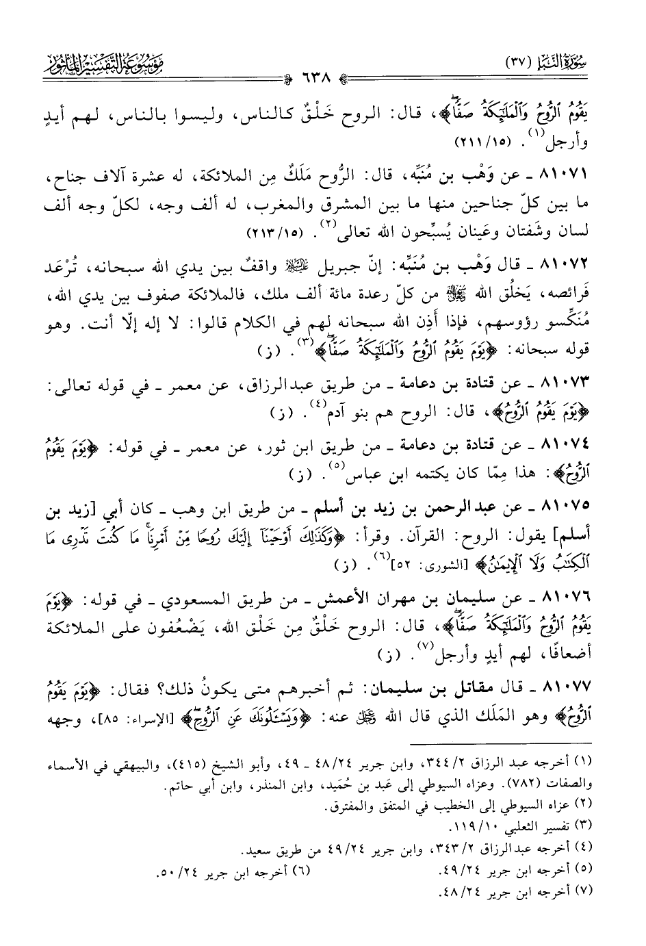 ٨١٠٧٧ - قال مقاتل بن سليمان: ثم أخبرهم متى يكونُ ذلك؟ فقال: {يَوْمَ يَقُومُ الرُّوحُ} وهو المَلَك الذي قال الله - عز وجل - عنه: {ويَسْأَلُونَكَ عَنِ الرُّوحِ} [الإسراء: ٨٥]، وجهه