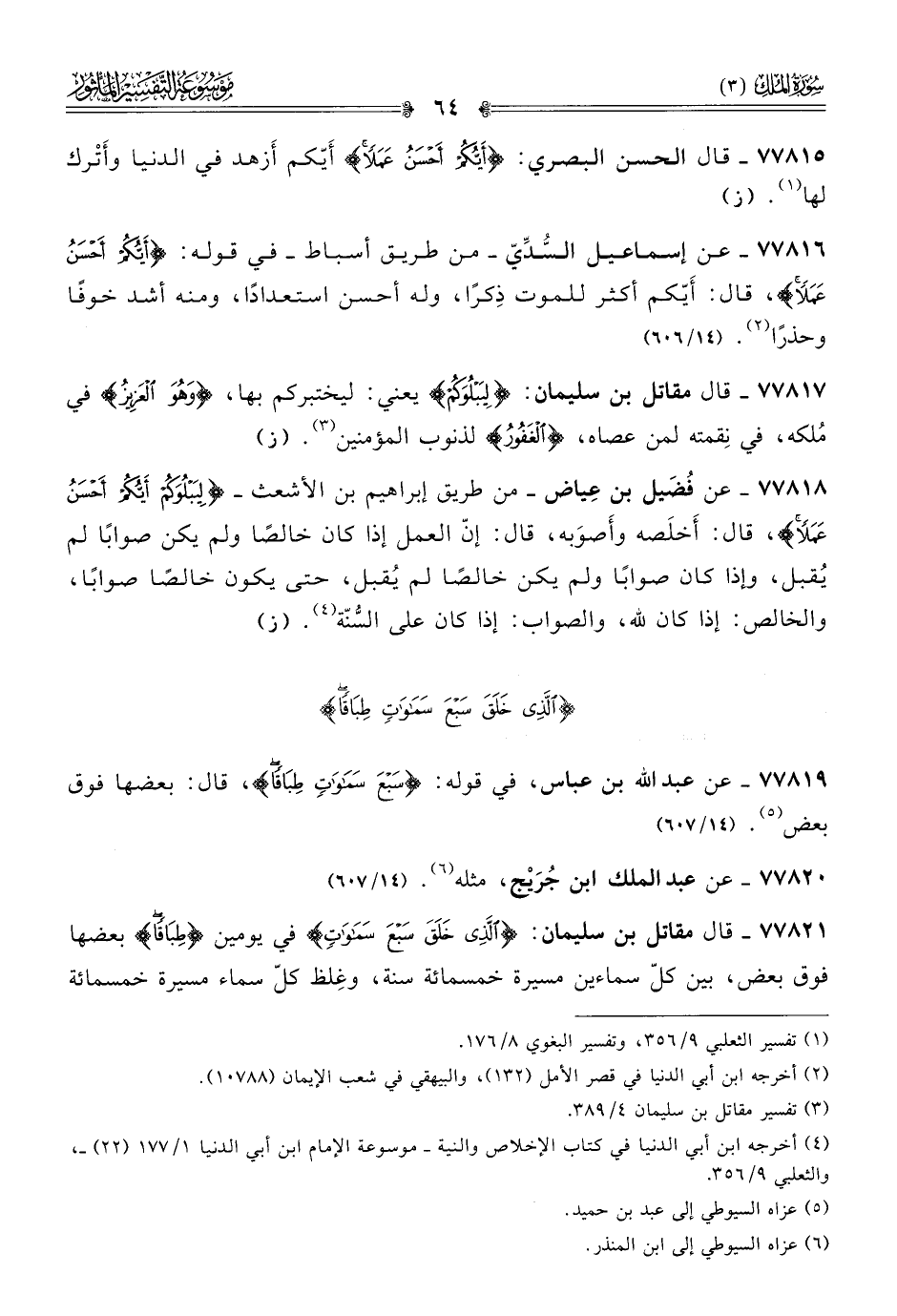 ٧٧٨١٥ - قال الحسن البصري: {أيُّكُمْ أحْسَنُ عَمَلًا} أيّكم أزهد في الدنيا وأَتْرك لها (¬١). (ز)