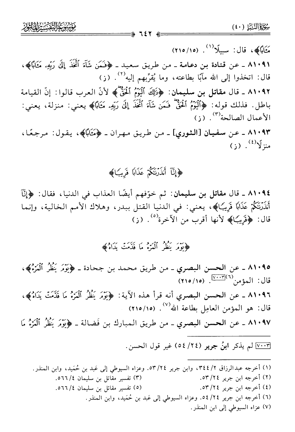 (¬١) أخرجه عبد الرزاق ٢/ ٣٤٤، وابن جرير ٢٤/ ٥٣. وعزاه السيوطي إلى عَبد بن حُمَيد، وابن المنذر.