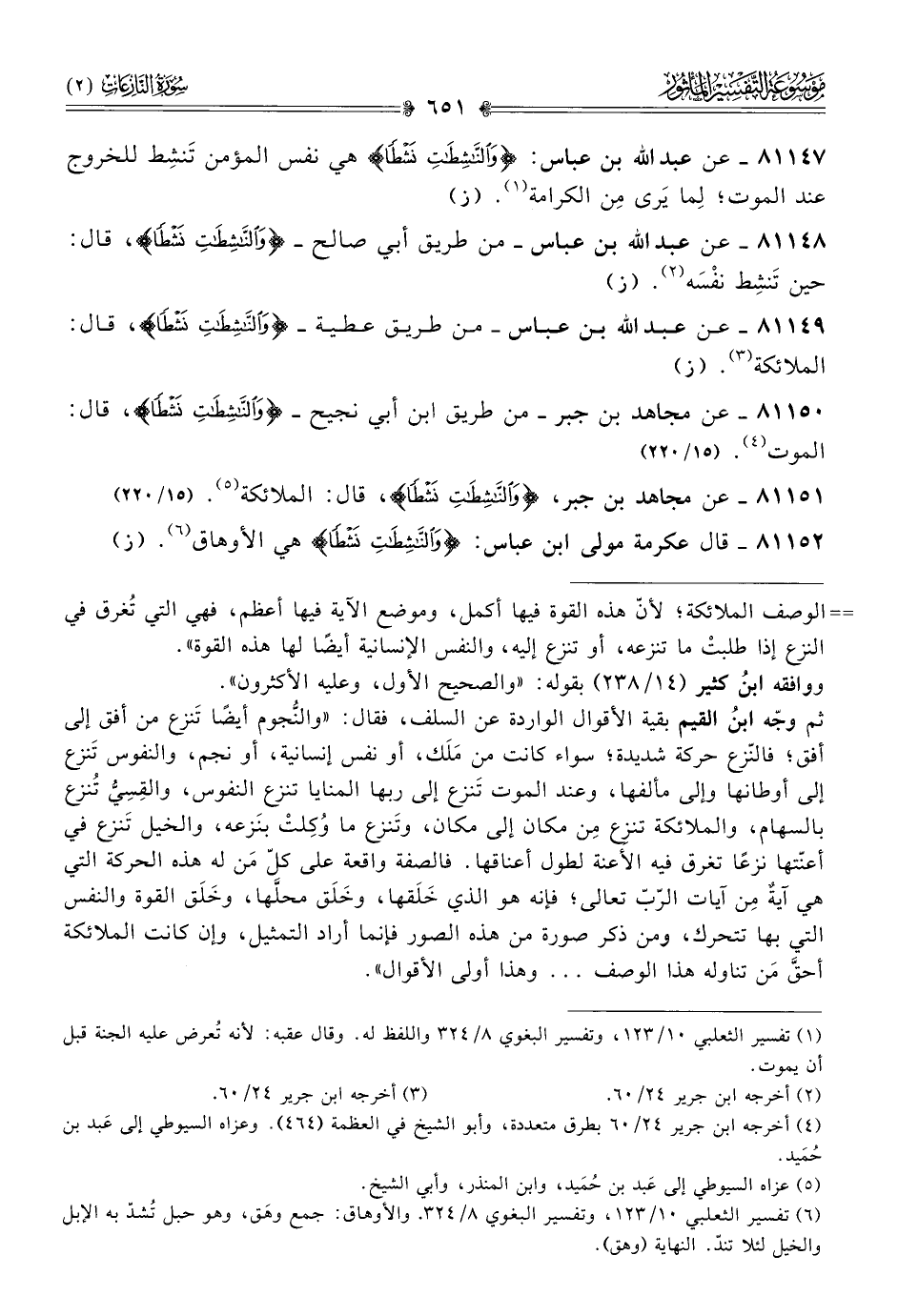 ٨١١٤٩ - عن عبد الله بن عباس -من طريق عطية- {والنّاشِطاتِ نَشْطًا}، قال: الملائكة (¬٣). (ز)