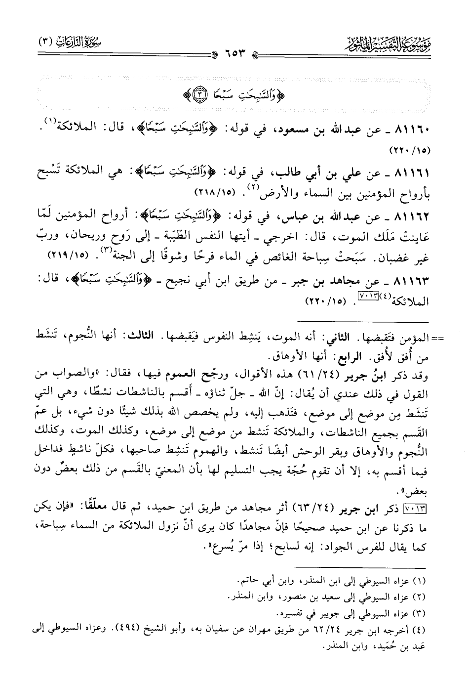٨١١٦٣ - عن مجاهد بن جبر -من طريق ابن أبي نجيح- {والسّابِحاتِ سَبْحًا}، قال: الملائكة (¬٤) [٧٠١٣]. (١٥/ ٢٢٠)